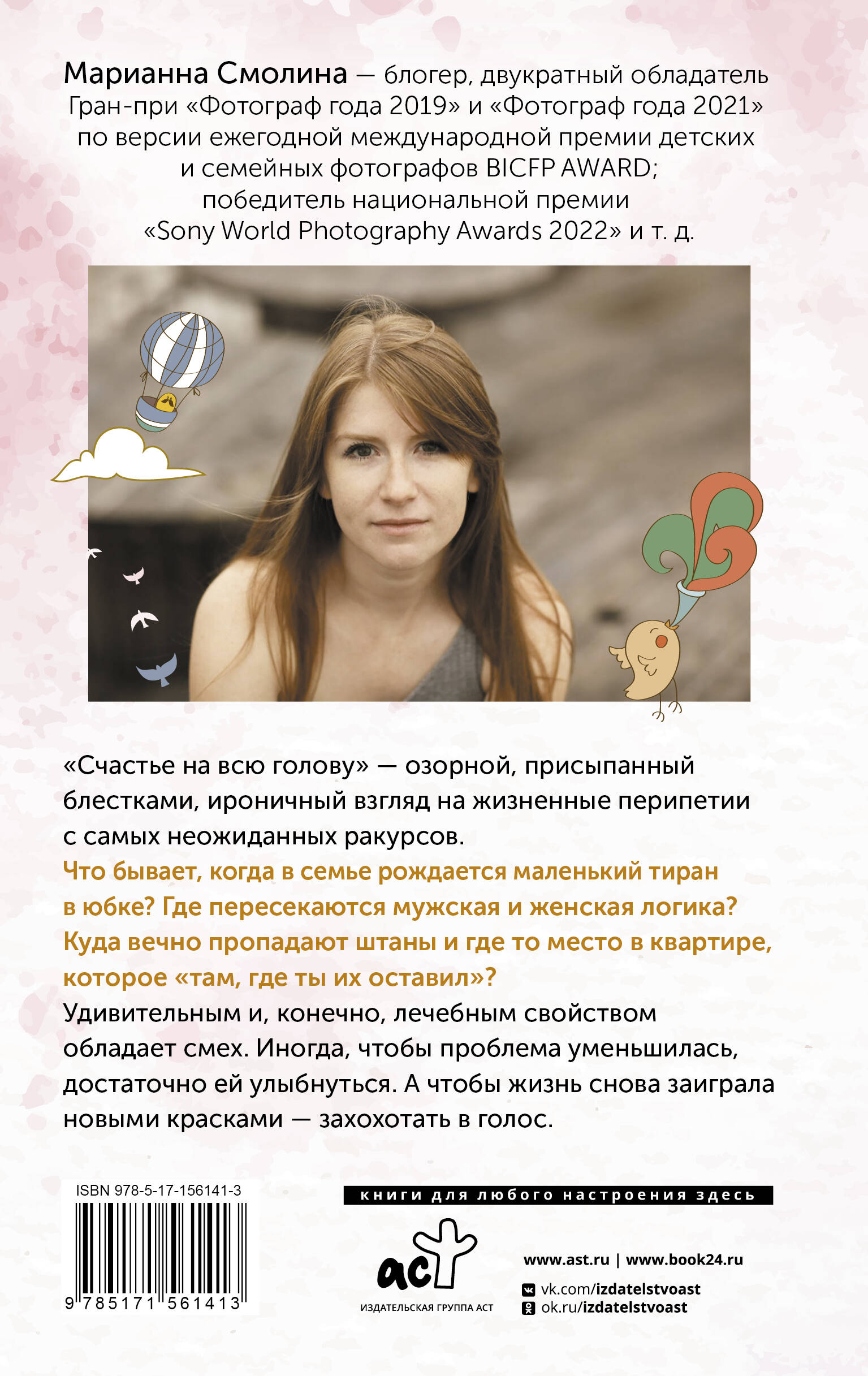 Марианна Смолина - автор с невероятным чувством юмора, профи по части поднятия настроения. И если вам грустно или одиноко, где бы вы ни находились, - возьмите в руки эту книгу! Яркие эмоции гарантированы! "Счастье на всю голову" - озорной, присыпанный блестками, ироничный взгляд на жизненные перипетии с самых неожиданных ракурсов. Вы узнаете, чем женская логика отличается от мужской, куда на самом деле сбегают носки и как отомстить детям за потраченные нервы, не дожидаясь внуков. Почувствуете тепло, поддержку близких и семейную "безуминку". Научитесь видеть маленькие чудеса в каждом дне. По-новому посмотрите на людей и перестанете "грызть" себя за несовершенства. С помощью отменного чувства юмора автор заставит смеяться от души, а ее творческий взгляд вынудит и вас увидеть в своей жизни яркие краски. Это не типичная книга "про счастье", в ней столько легкости и озорства, что она непременно зарядит вас оптимизмом. Если вам грустно или одиноко, скорее начинайте читать - гарантированно получите заряд положительных эмоций.| Издательство | ИЗДАТЕЛЬСТВО "АСТ" |