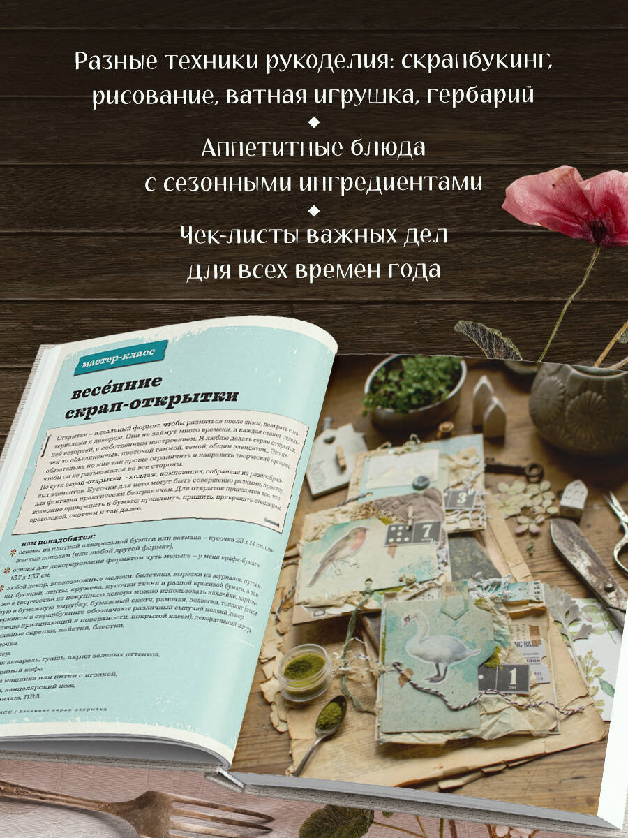 Как часто вы замечаете красоту природы, любуетесь чистым небом, необычной формой листочка на дереве, наслаждаетесь пением птиц? В спешке и суете мы перестаем видеть прекрасное, которое окружает нас на каждом шагу, теряем вдохновение и способность к творчеству. Откройте волшебство каждого месяца и погрузитесь в мир весенних цветов, летнего солнца, осенних красок и зимних узоров! Надя Хмелевская, автор этой книги, считает, что творчество просто необходимо человеку, а идеи можно найти в природе, такой разной и одновременно прекрасной в любое время года. Вдохновитесь на создание очаровательных поделок: карандашных и акварельных ботанических иллюстраций, чтобы запечатлеть на бумаге дары природы, декоративных подвесок с отпечатками растений, которые удачно завершат ваш образ, весенних скрап-открыток, которые можно будет вложить в конверт и отправить друзьям. Вместе с автором смастерите украшения для интерьера, например, венок из пряных трав, аромат которого наполнит ваш дом, или ватные елочные игрушки, что украсят вашу елку в ближайший Новый год. Побалуйте близких чудесным меренговым рулетом с клубникой, идеальным тыквенным супом, полезным клюквенным вареньем, рождественским творожным штолленом, аппетитным блинным тортом на Масленицу и другими вкусными сезонными блюдами. На каждый сезон составьте список самых важных дел, которые просто необходимо сделать в этот период, например, походить босиком по траве или послушать пение птиц в лесу. Это нужно, чтобы полностью прожить каждый месяц, прочувствовать его и научиться находить прекрасное даже в самые хмурые дни!| Издательство | ООО "Издательство "Эксмо" |