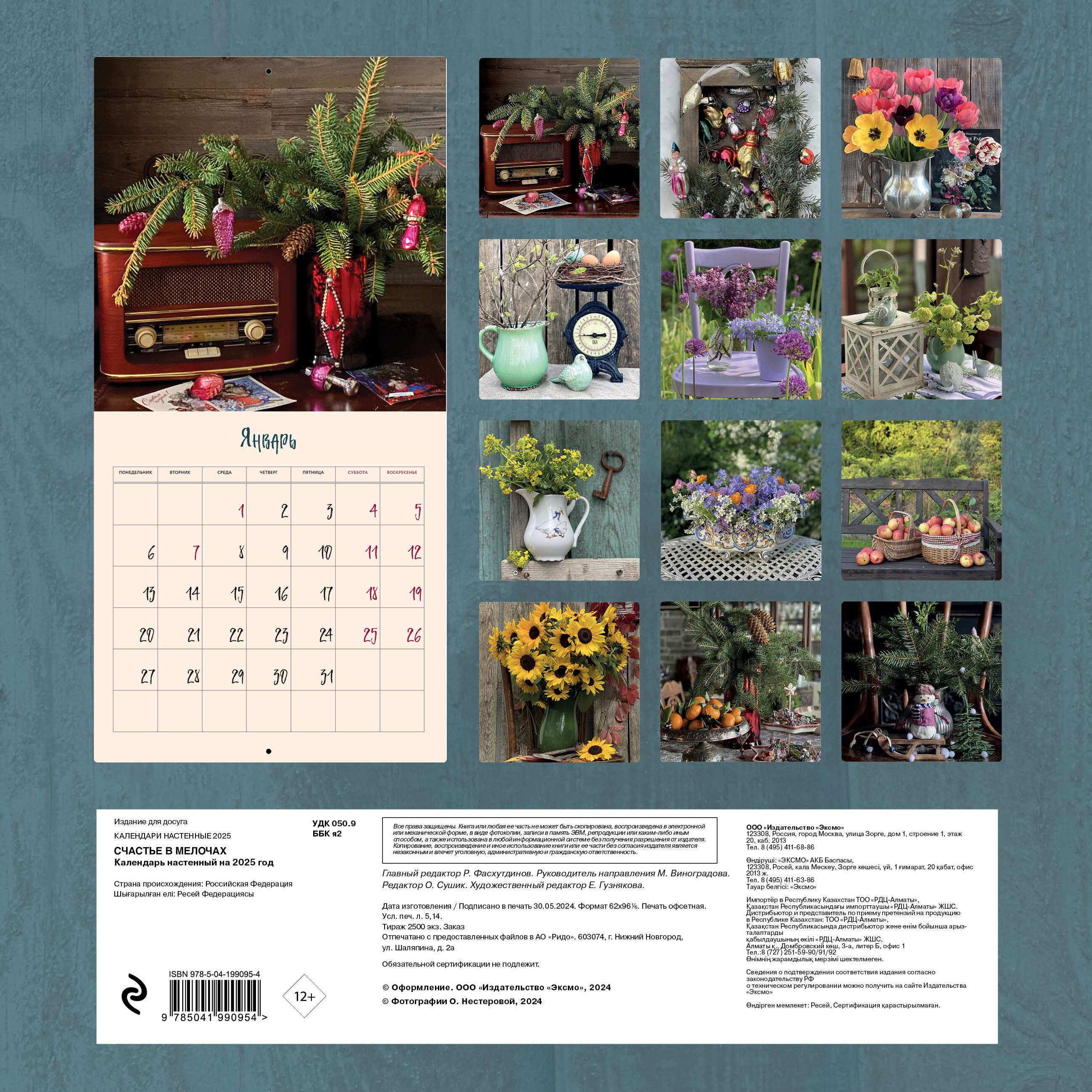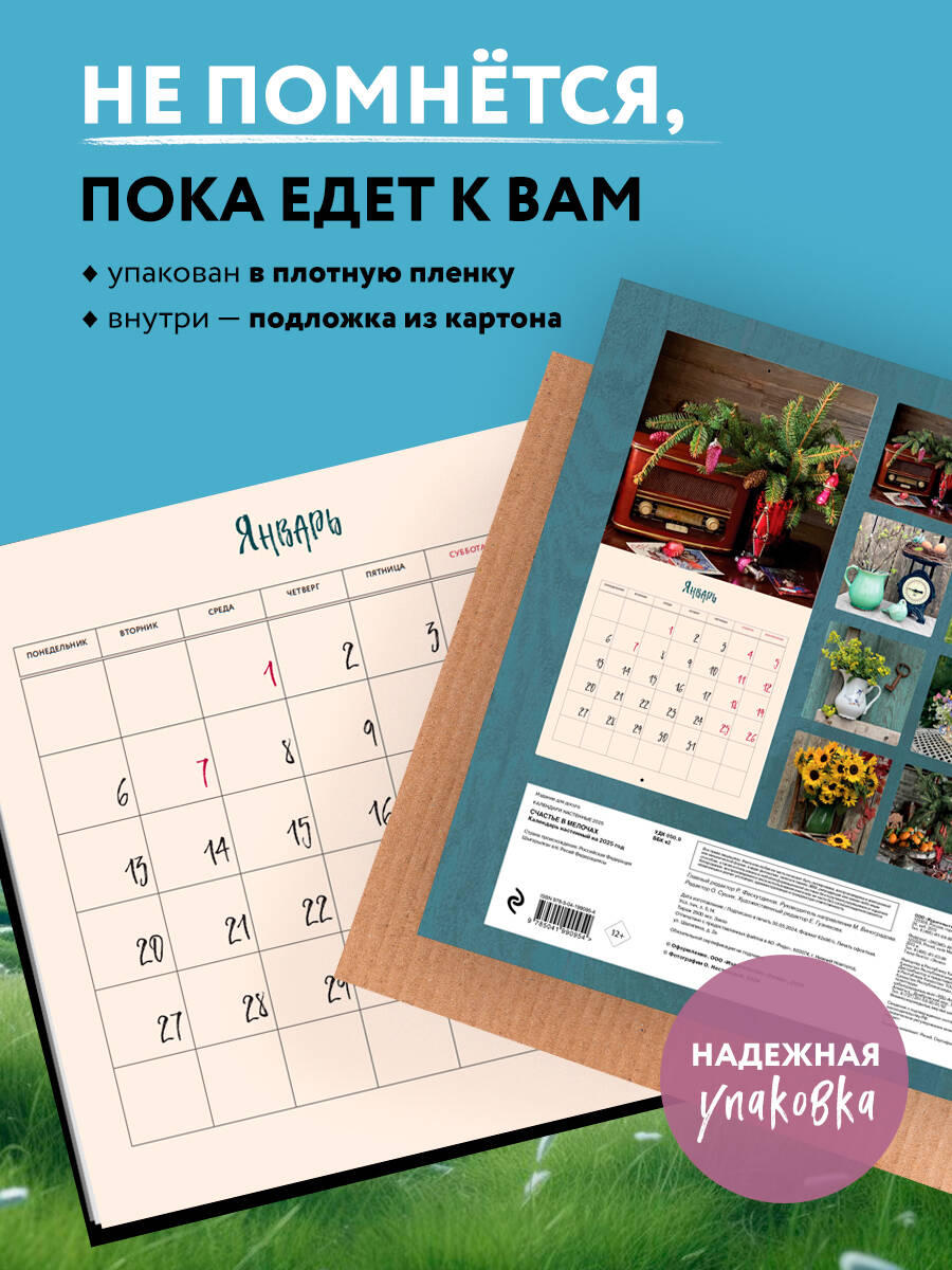 Наши настенные календари отличаются высоким качеством исполнения! Тщательно подобранные иллюстрации, напечатанные на глянцевой бумаге высочайшего качества, станут настоящим украшением дома, а в календарной сетке найдется место для ваших планов: большие клетки позволят делать записи и организовать свой год! В серии настенных календарей издательства «ЭКСМО» каждый найдет тему по вкусу: великие художники, великолепные подборки с самыми знаменитыми произведениями искусства, легендарные кинематографические саги и игры, главные книжные авторы и бестселлеры, фотографии и иллюстрации любимых животных и многое-многое другое! О календаре: Авторский календарь Ольги Нестеровой который год сулит нам не забывать о том, что счастье в мелочах. В солнечных лучах и капельках дождика, в конфетах на столе, в красивых памятных статуэтках и приятном пейзаже в любое время года! Технические параметры: - Тип календаря - настенный перекидной. - Год - 2025. - Календарная сетка - с разбивкой по месяцам. - Вид скрепления - скрепка. - Ширина - 30 см. - Высота - 30 см. - Внутренний блок - мелованная бумага 150 г/м2. - Подложка - плотный гофрокартон для поддержания формы. - Индивидуальная упаковка в плотный целлофановый пакет.