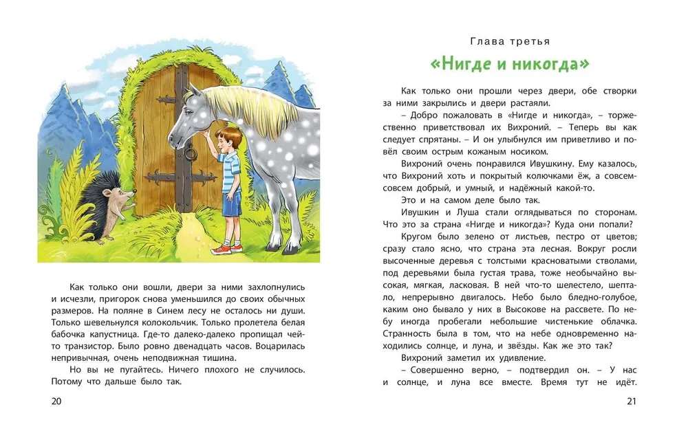 Филя Ивушкин скоро переезжает из деревни в город. Вот только мальчик совсем этому не рад - ведь он не может взять с собой любимую лошадь Лушу. Неразлучные друзья решили сбежать - и попали в волшебную страну «Нигде и никогда». В этом чудесном месте нет времени, зато там обитает много разных удивительных существ, каждое из которых преподнесёт друзьям важный урок... Увлекательная сказочная повесть известной детской писательницы Ирины Токмаковой оформлена красочными рисунками Вячеслава Кривенко. Для младшего школьного возраста.| Издательство | ЭНАС-КНИГА |