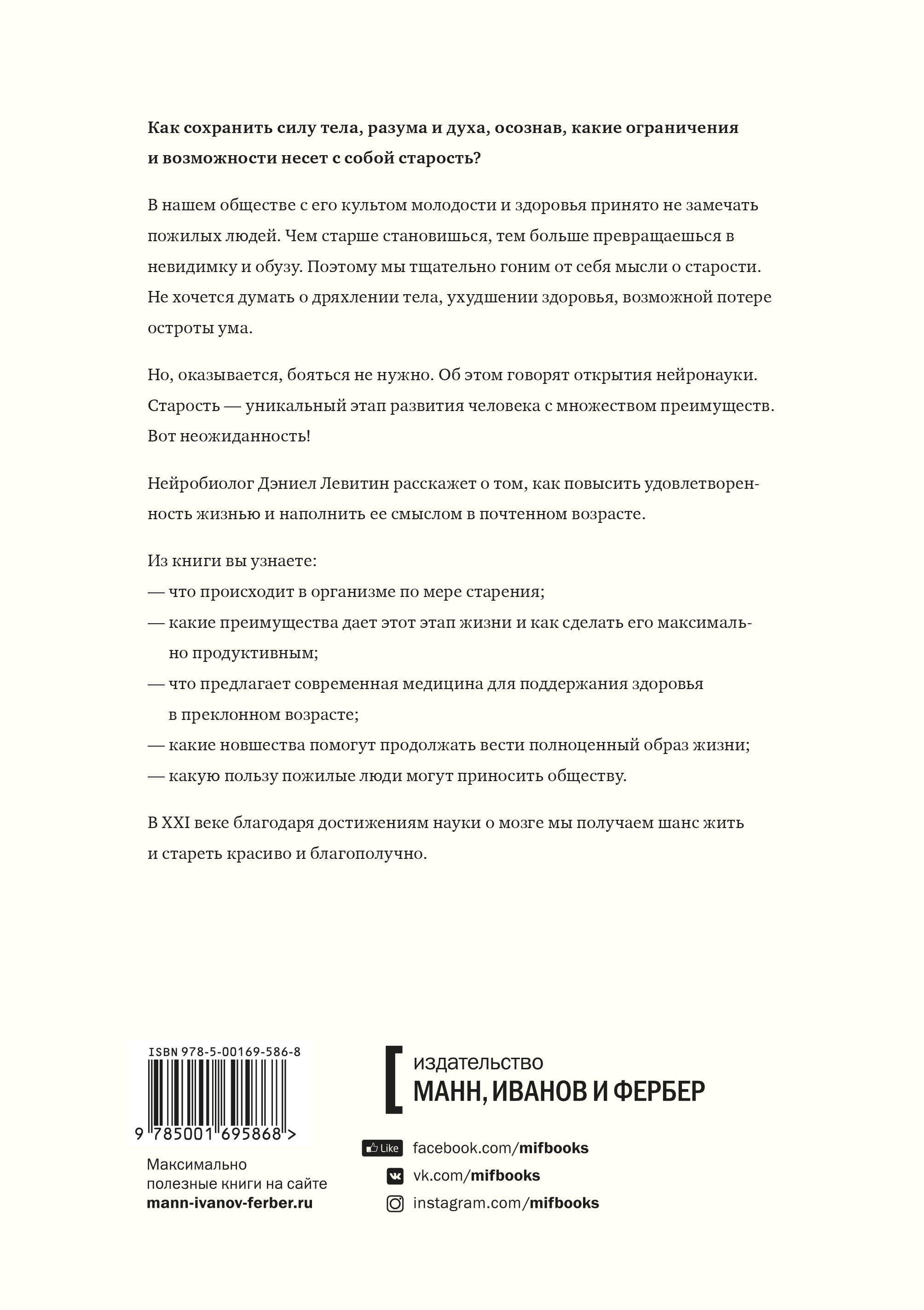 Книга известного нейробиолога, психолога и писателя Дэниела Левитина о сохранении физического и психологического здоровья на долгие годы. Люди испытывают к старости двойственные чувства: и ждут ее, и боятся ее наступления. На самом деле часто нас страшит не этот новый этап, а невозможность наслаждаться полнотой жизни. Автор книги отвечает на вопросы: Что делать в любом возрасте, чтобы жить долго и счастливо? Как сохранить память и умственные способности? Что можно сделать, чтобы сохранить силу тела, разума и духа, примирившись с теми ограничениями, которые несет с собой старость? Как представителям разных поколений найти общий язык? Как вообще воспринимать старость как кульминацию жизни, а не ее финал? Основываясь на данных нейронауки, Дэниел Левитин делится советами о том, как можно изменить мозг и мышление, чтобы максимально повысить удовлетворенность жизнью и наполнить ее смыслом в почтенном возрасте. Он пишет о том, как продлить период активной полноценной жизни и показывает, что даже незначительные изменения приносят большую пользу. Прочитав эту книгу, вы сможете использовать полученные знания, чтобы заранее определить предстоящие перемены (как положительные, так и отрицательные) и подготовиться к ним на любом этапе жизненного пути. Начинать изменения никогда не поздно! От автора: Возможно, разум пожилых людей медленнее обрабатывает информацию, но они могут свести воедино огромный объем знаний, накопленных в течение жизни, и принимать более мудрые решения, опираясь на десятки лет учебы на собственных ошибках. Одно из многочисленных преимуществ пожилых людей состоит в том, что они меньше боятся трудностей, поскольку в прошлом уже сталкивались с ними и сумели преодолеть. Жизнестойкость таких людей (как их собственная, так и в супружеской паре) - это и есть то, на что, на их взгляд, они могут положиться. Вместе с тем люди преклонного возраста спокойно воспринимают мысль о приближающейся смерти. Это не значит, что они хотят умереть - они просто больше не боятся смерти. Они живут полной жизнью и воспринимают каждый новый день как возможность получить новые впечатления. Мне как нейробиологу всегда было интересно, почему некоторые из нас стареют благополучнее других. В чем причина - в генетике, личных качествах, социально-экономическом положении или просто в удаче? Какие процессы, протекающие в мозге, стимулируют такие перемены? Что можно сделать, для того чтобы остановить снижение когнитивной и физической активности, сопутствующее старению? Одни люди преуспевают в 80 и 90 лет, тогда как другие словно уходят от жизни, становясь изолированными от общества, несчастными узниками собственной немощи. В какой степени мы контролируем финал своей жизни и насколько он предопределен? Для кого книга: Для тех, кто хочет узнать аспекты здорового старения. Для тех, кто хочет понять, как можно повлиять на процесс старения в любом возрасте, чтобы как можно дольше оставаться активным, здоровым и счастливым.| Издательство | МАНН, ИВАНОВ И ФЕРБЕР ООО |