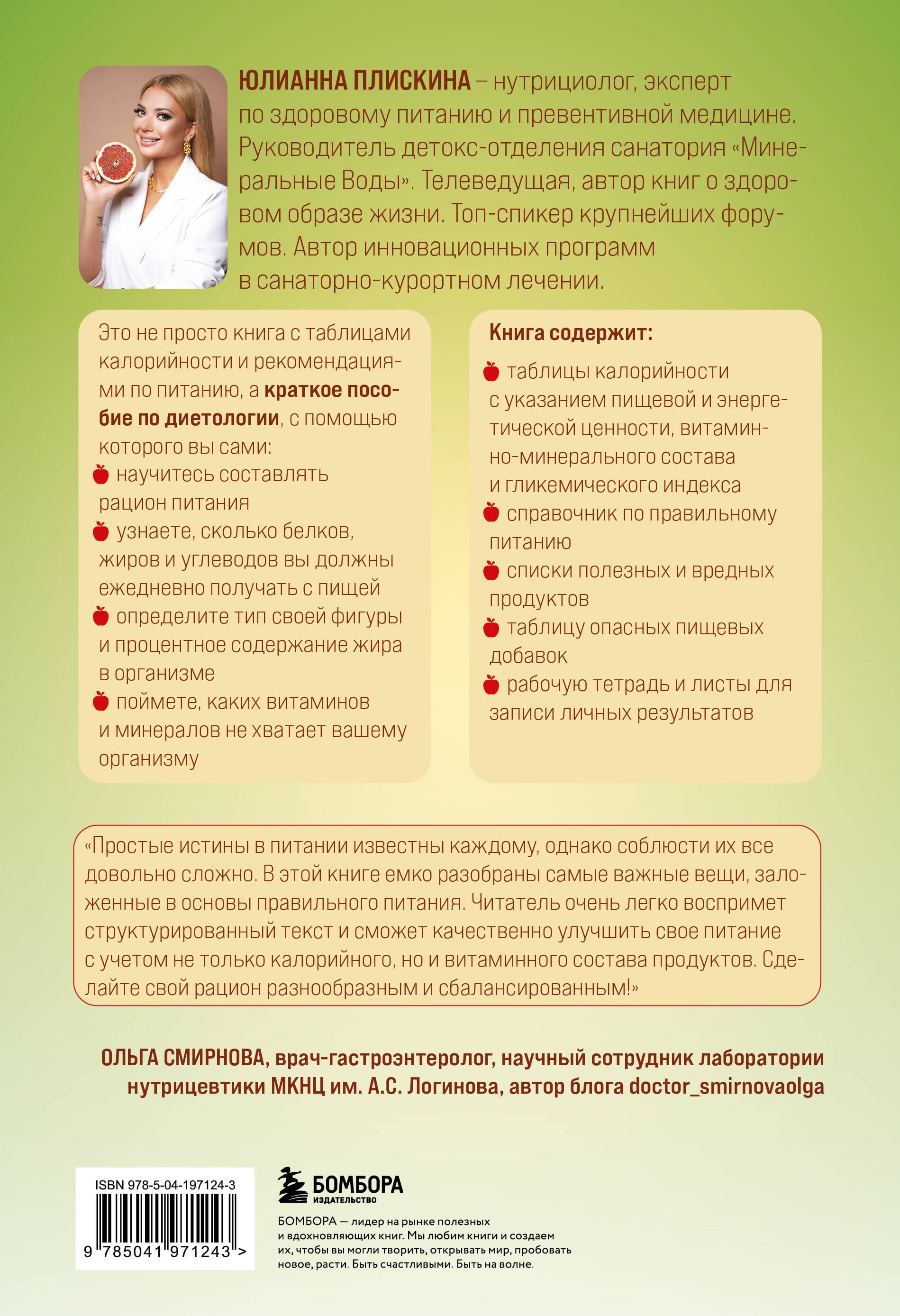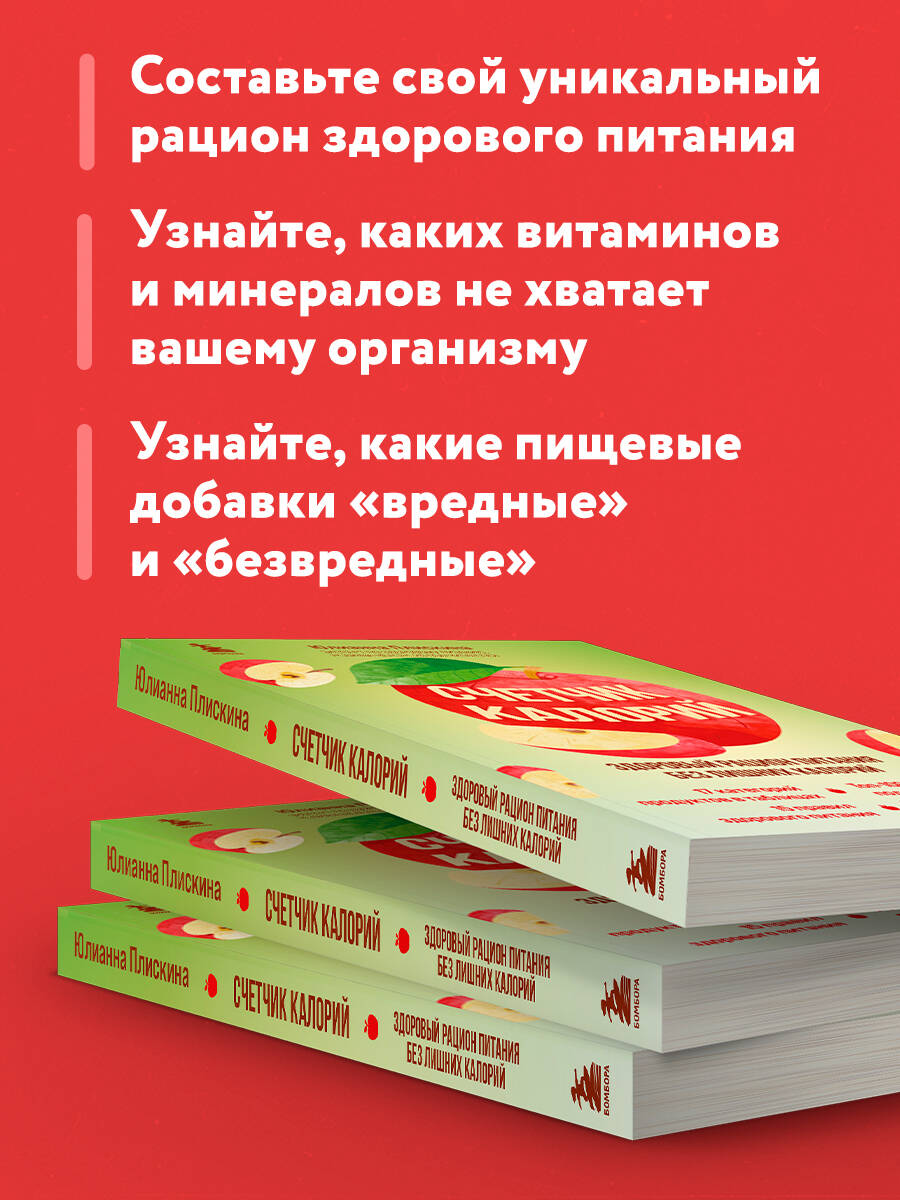 «Счетчик калорий» - это не просто скучный набор таблиц калорийности продуктов, а целый справочник по основам диетологии и ключевым принципам правильного питания. Юлианна Плискина, эксперт по здоровому питанию, разработала пошаговую программу, чтобы легко сбалансировать ваш рацион. Автор расскажет об основных принципах питания, принятых в диетологии, поможет определить ваше физическое состояние, а также даст множество советов о выборе самых полезных продуктов. Вы научитесь: · правильно питаться; · определять потребности своего организма; · разрабатывать рацион, сбалансированный по содержанию жиров, белков, углеводов, витаминов и минералов; · выбирать качественные продукты в магазине и оценивать их состав. В практической части книги вы сможете: · узнать ваш идеальный вес и индекс массы тела; · рассчитать индивидуальную суточную энергетическую потребность; · вычислить, сколько калорий нужно употреблять с пищей, чтобы похудеть; · ставить личные цели, вести дневник питания и составлять план тренировок. «Счетчик калорий» - первый в России справочник с таблицами калорийности, в которых кроме пищевой и энергетической ценности продуктов учитывается их полный витаминный и минеральный состав, а также гликемический индекс. «Простые истины в питании известны каждому, однако соблюсти их все довольно сложно. В этой книге емко разобраны самые важные вещи, заложенные в основы правильного питания. Читатель очень легко воспримет структурированный текст и сможет качественно улучшить своё питание с учётом не только калорийного, но и витаминного состава продуктов. Сделайте свой рацион разнообразным и сбалансированным!» - ОЛЬГА СМИРНОВА, врач-гастроэнтеролог, научный сотрудник лаборатории нутрицевтики МКНЦ им. А.С. Логинова, автор блога doctor_smirnovaolga «Правильное питание и здоровый образ жизни основа хорошего самочувствия и долголетия! Очень здорово, что книга Юлианны Плискиной дает наглядные готовые инструменты для составления рациона питания. Держите книгу Юлианны всегда под рукой, и не заметите, как правильное питание станет вашей полезной привычкой!» - ЧЕНЦОВ ДМИТРИЙ ВИКТОРОВИЧ, Главный врач СПб ГАУЗ «Городская поликлиника № 40»| Издательство | ООО "Издательство "Эксмо" |