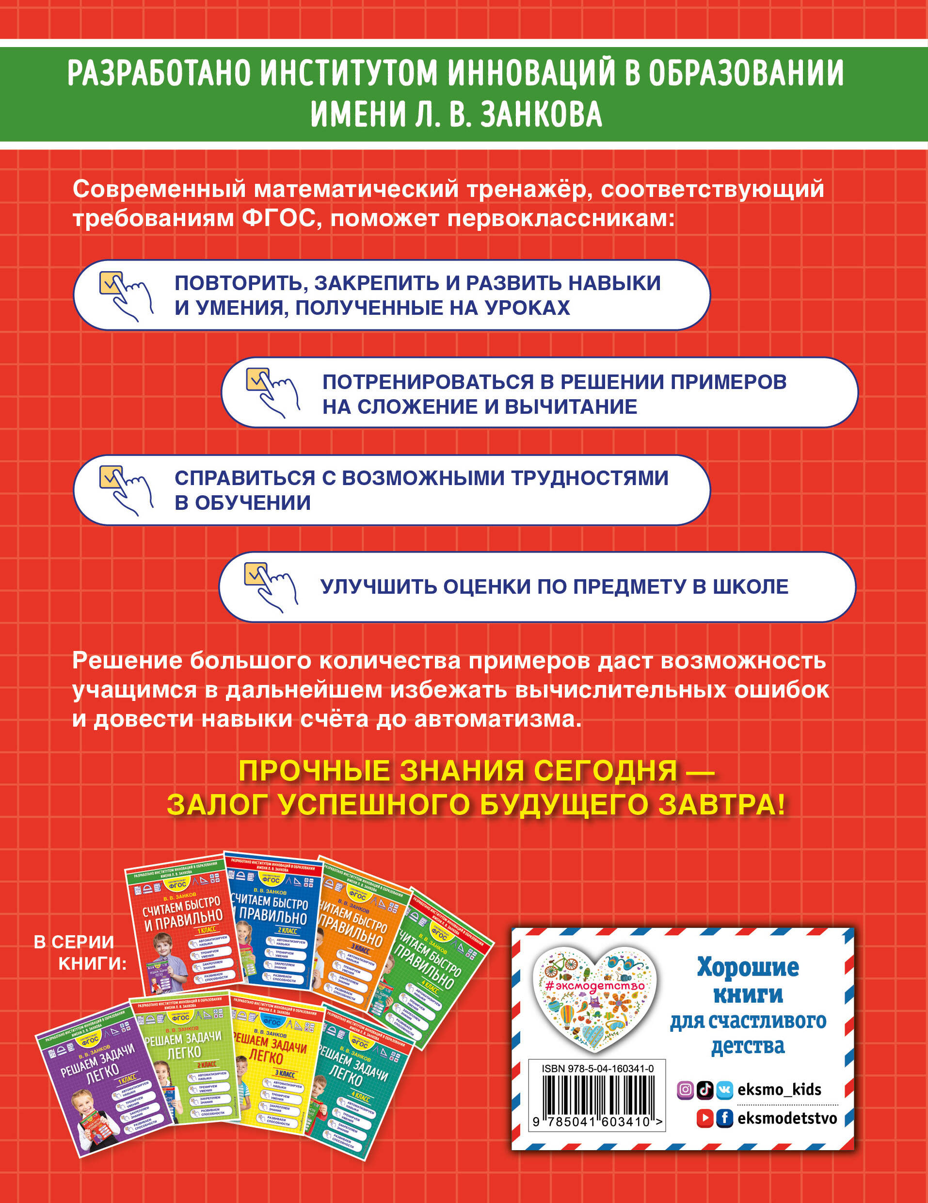 Пособие, соответствующее ФГОС, станет отличным помощником для учеников 1-го класса в отработке умений и навыков, полученных на уроках математики. Решение большого количества примеров на сложение и вычитание даст возможность школьникам в дальнейшем избежать вычислительных ошибок и довести навыки счёта до автоматизма. Занимаясь по книге, учащиеся смогут: 1. Повторить и закрепить пройденный материал. 2. Восполнить пробелы в знаниях. 3. Повысить успеваемость по предмету. 4. Развить математические способности.| Издательство | Эксмо |