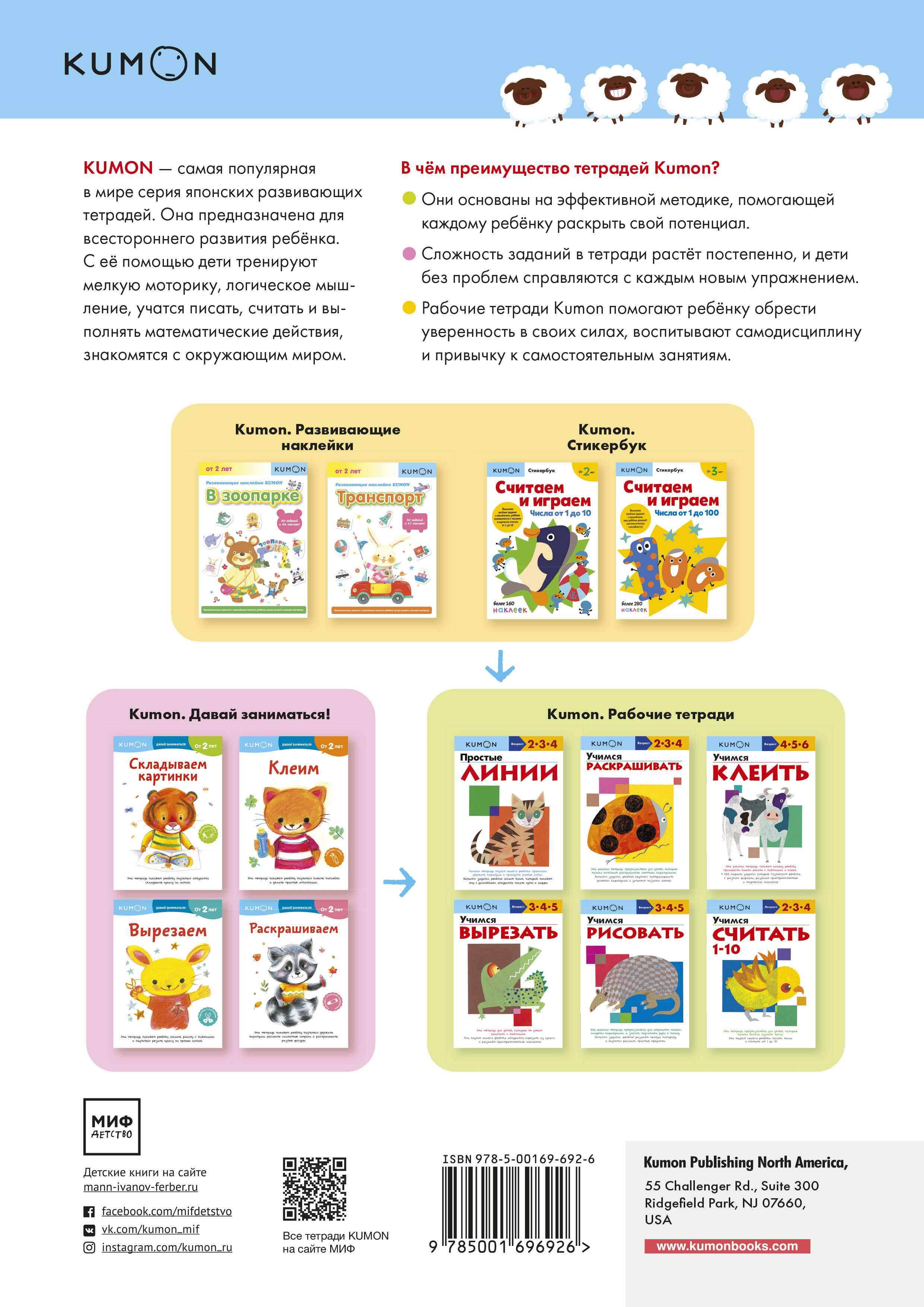 Тетрадь "Kumon. Считаем и играем. Числа от 1 до 100" поможет ребенку запомнить числа и научиться считать до 100. С помощью этого стикербука ребенок: - повторит счет от 1 до 10; - научится считать до 100 по порядку и десятками; - запомнит порядок чисел; - разовьет мелкую моторику рук, приклеивая наклейки различной формы. Задания в тетради строятся по принципу "от простого к сложному". Изучая каждую группу чисел, ребенок будет выполнять упражнения трех типов: приклеивать наклейку в любое место на странице, куда ему хочется; наклеивать наклейку с числами на соответствующий кружок и называть числа вслух; наклеивать наклейки на соответствующие числа, называть их вслух и соединять пальчиком по порядку. Для кого эта книга: Для детей от 3 лет, которые учатся считать. О серии Серия "Стикербук" разработана для малышей от 2 лет. Играя с наклейками, ребенок запомнит цифры и научится считать, разовьет мелкую моторику рук и логическое мышление, расширит словарный запас и станет лучше говорить. Дети любят стикербуки. С них проще всего начинать систематические занятия дома и формировать привычку к обучению. Важно! Рекомендуемый возраст на тетради указан для ориентира. Выбирайте пособие, учитывая индивидуальные особенности ребенка.| Издательство | МАНН, ИВАНОВ И ФЕРБЕР ООО |