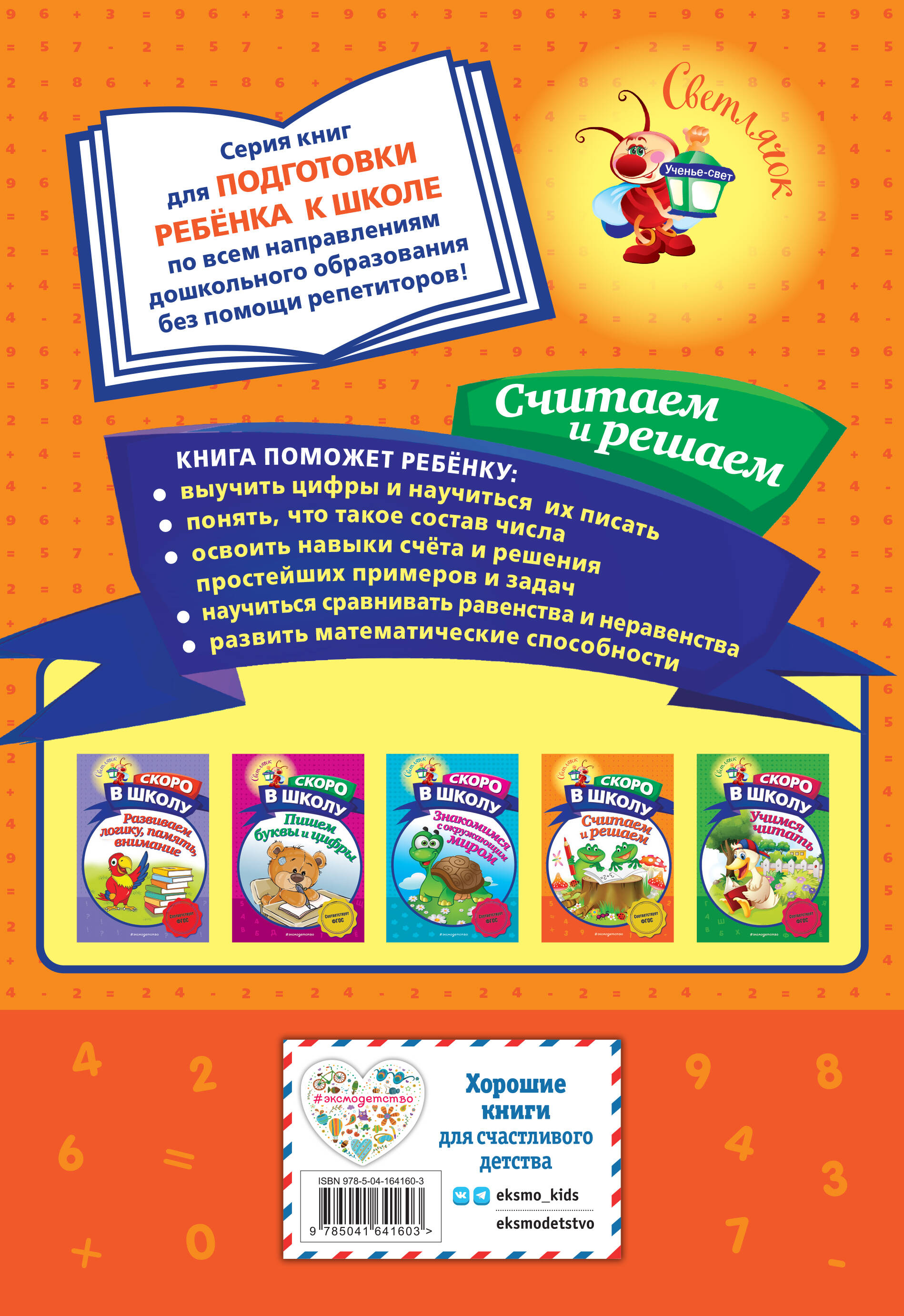 Цель книги - в игровой форме подготовить ребёнка к школе без помощи репетиторов. Выполняя увлекательные игровые задания, ребёнок повторит понятия «больше», «меньше», «столько же», «один», «несколько», «много»; научится складывать и вычитать с помощью числовой прямой; сравнивать и решать простейшие примеры и задачи; соотносить число и количество; делить предметы на группы; станет более усидчивым, а главное, уверенным в себе и позитивно настроенным к обучению. Приобретая пособие для своего ребёнка, вы поможете ему в минимальные сроки: • развить математические способности; • понять. что такое состав числа; • попрактиковаться в написании цифр; • закрепить навыки счёта; • потренировать мелкую моторику, логику, внимание.| Издательство | ООО "Издательство "Эксмо" |