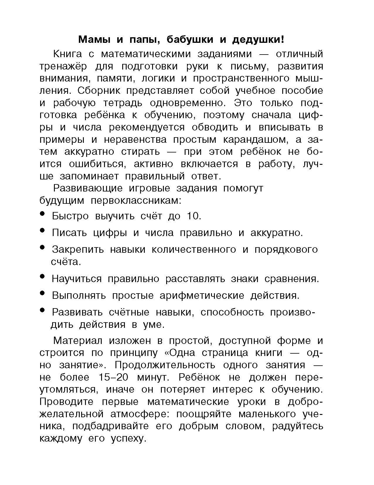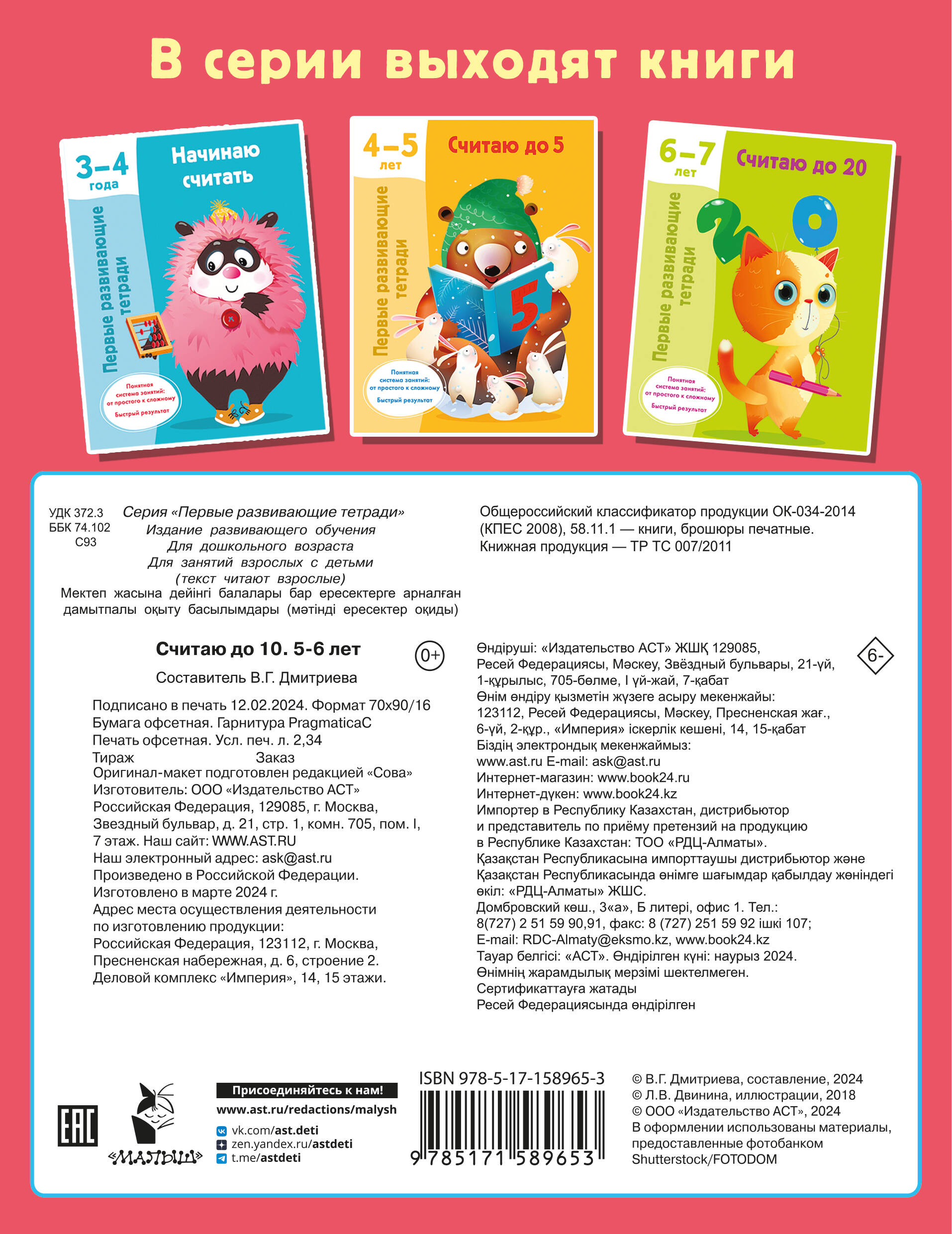 В серии «Первые развивающие тетради» - книги для любознательных малышей и заботливых родителей. Рабочая тетрадь «Считаю до 10. 5-6 лет» представляет интерес для будущих первоклассников, а также их родителей, - игровые задания развивают интеллект, формируют математические представления и ориентацию в пространстве, закрепляют правила выполнения простых арифметических действий. Приобретая это пособие для своего ребёнка, вы поможете ему: • подготовить руку к письму, научиться держать ручку и карандаш; • запомнить правильное начертание цифр; • потренироваться в сложении и вычитании; • развить мышление, логику, внимание, память; • стать более усидчивым и аккуратным.| Издательство | Издательство "АСТ" |