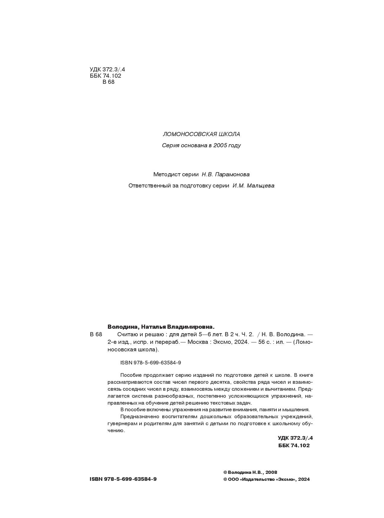 Аннотация: Считаю и решаю: для детей 5-6 лет. Ч. 2, 2-е изд., испр. и перераб.