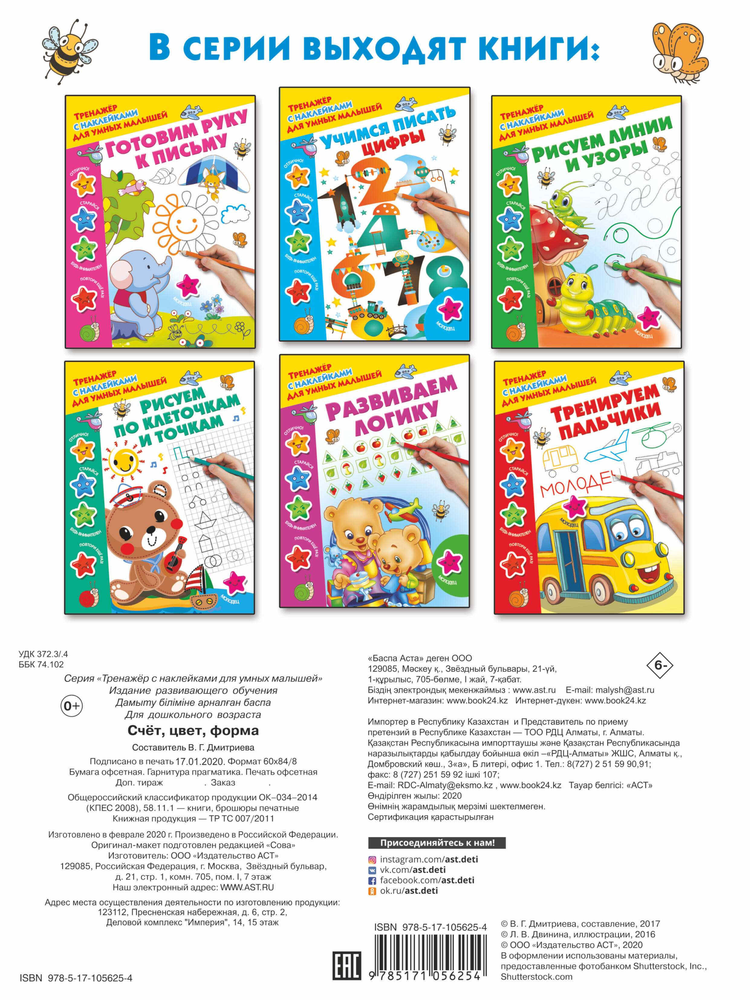 О чем эта книга Книжка, которую вы держите в руках, - это развивающие прописи для знакомства с цифрами, цветами и геометрическими формами. Кому эта книга будет интересна Занимательная, полезная книжка с наклейками-оценками для малышей, которые хотят выучить цифры, различать геометрические формы, запомнить названия цветов. Каковы особенности этой книги - Занимательная, полезная книжка поможет ребенку научиться сравнивать предметы по цвету и форме. - Занимаясь по этой книжке, малыш выучит порядковый и количественный счет. - Плотная белая бумага позволит использовать ручки, карандаши и даже фломастеры, а наклейки-оценки сделают подготовку руки к письму интересной и увлекательной. - Наклейки-оценки - отличная идея, чтобы похвалить ребенка за первые успехи в освоении новых знаний. Учить - легко, учиться - интересно!| Издательство | ИЗДАТЕЛЬСТВО "АСТ" |