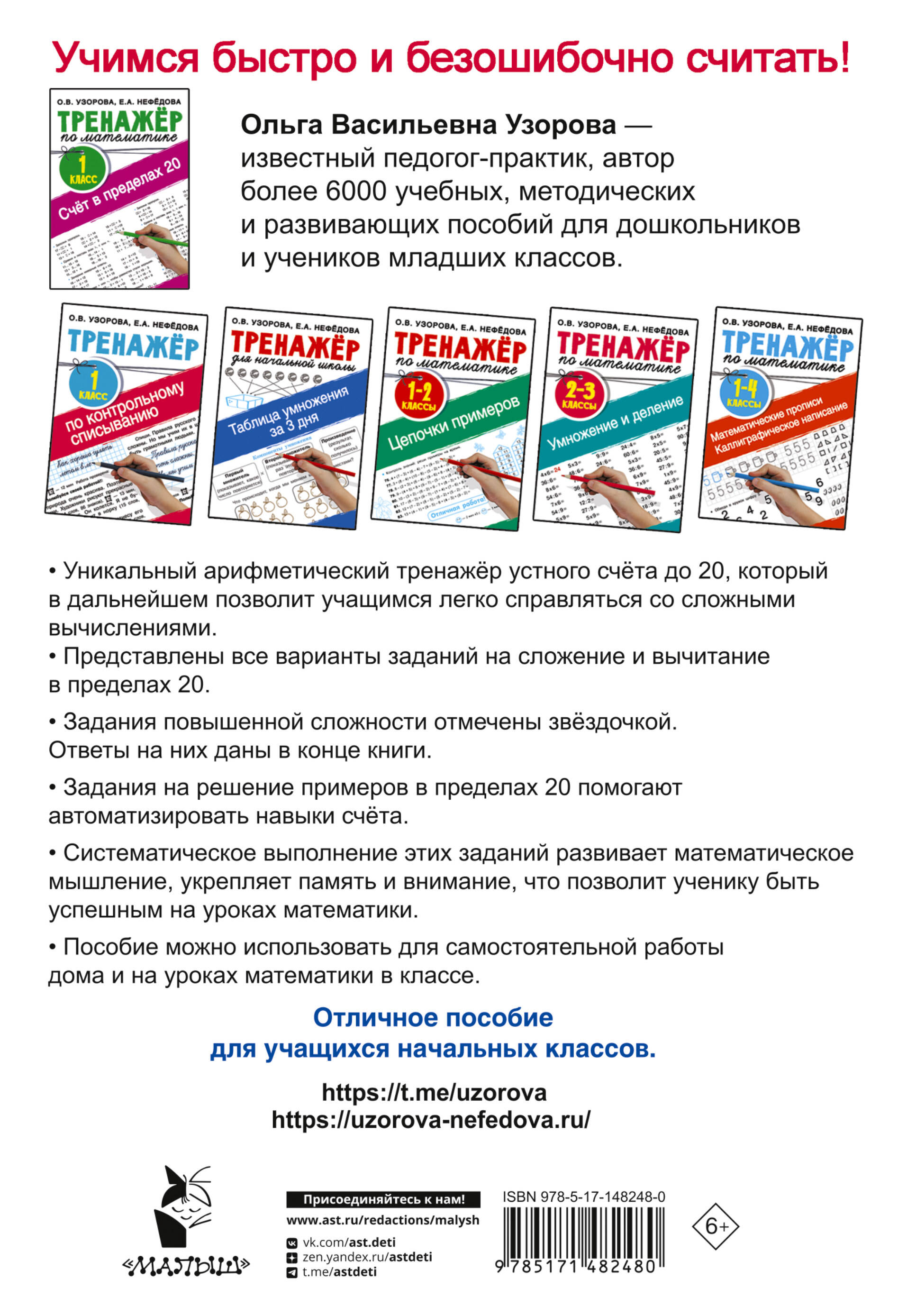 Пособие предназначено для учащихся начальной школы, а также будет полезно родителям и учителям. Книга поможет ребёнку запомнить состав числа и автоматизировать навык счёта в пределах 20.| Издательство | АСТ |