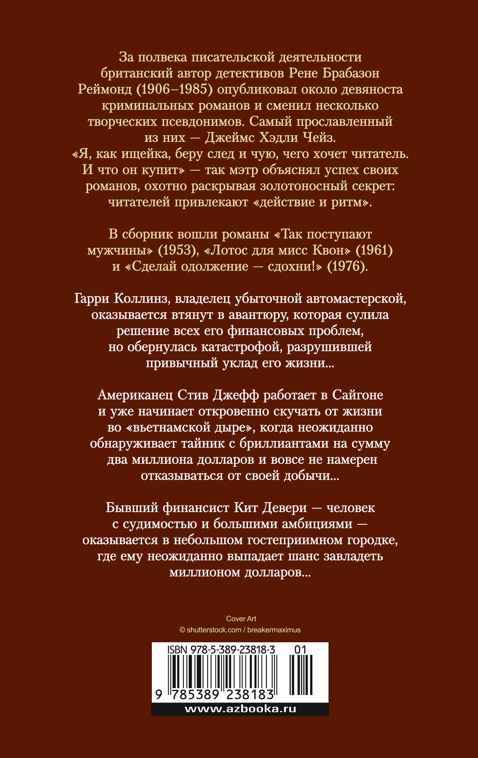 За полвека писательской деятельности британский автор детективов Рене Брабазон Реймонд (1906-1985) опубликовал около девяноста криминальных романов и сменил несколько творческих псевдонимов. Самый прославленный из них - Джеймс Хэдли Чейз. "Я, как ищейка, беру след и чую, чего хочет читатель. И что он купит" - так мэтр объяснял успех своих романов, охотно раскрывая золотоносный секрет: читателей привлекают "действие и ритм". В сборник вошли романы "Так поступают мужчины" (1953), "Лотос для мисс Квон" (1961) и "Сделай одолжение - сдохни!" (1976). Гарри Коллинз, владелец убыточной автомастерской, оказывается втянут в авантюру, которая сулила решение всех его финансовых проблем, но обернулась катастрофой, разрушившей привычный уклад его жизни… Американец Стив Джефф работает в Сайгоне и уже начинает откровенно скучать от жизни во "вьетнамской дыре", когда неожиданно обнаруживает тайник с бриллиантами на сумму два миллиона долларов и вовсе не намерен отказываться от своей добычи... Бывший финансист Кит Девери - человек с судимостью и большими амбициями - оказывается в небольшом гостеприимном городке, где ему неожиданно выпадает шанс завладеть миллионом долларов...| Издательство | Азбука-Аттикус Издат.группа ООО |