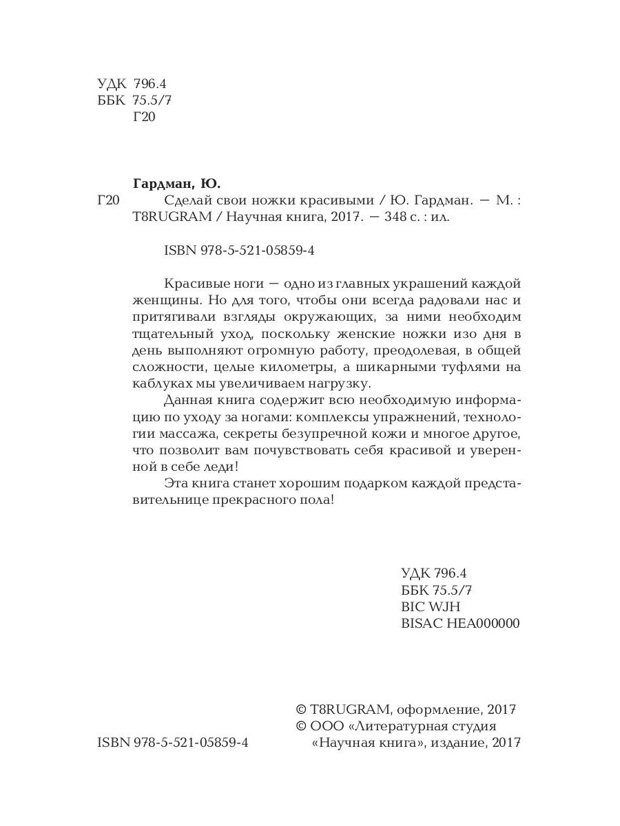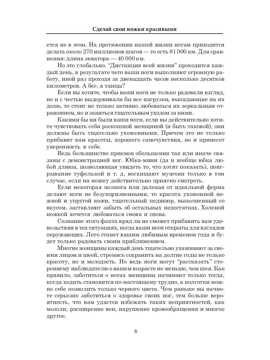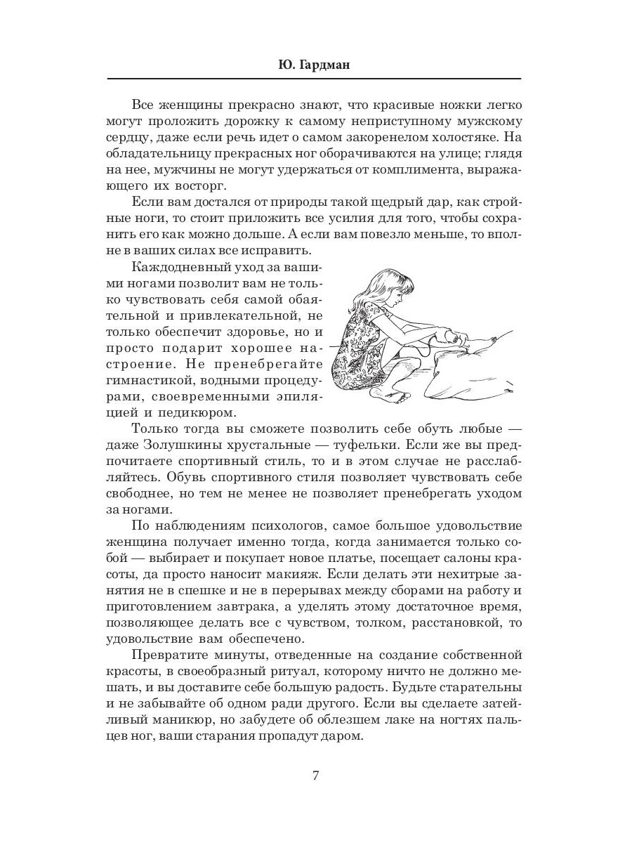 Красивые ноги - одно из главных украшений каждой женщины. Но для того, чтобы они всегда радовали нас и притягивали взгляды окружающих, за ними необходим тщательный уход, поскольку женские ножки изо дня в день выполняют огромную работу, преодолевая, в общей сложности, целые километры, а шикарными туфлями на каблуках мы увеличиваем нагрузку. Данная книга содержит всю необходимую информацию по уходу за ногами: комплексы упражнений, технологии массажа, секреты безупречной кожи и многое другое, что позволит вам почувствовать себя красивой и уверенной в себе леди! Эта книга станет хорошим подарком каждой представительнице прекрасного пола!