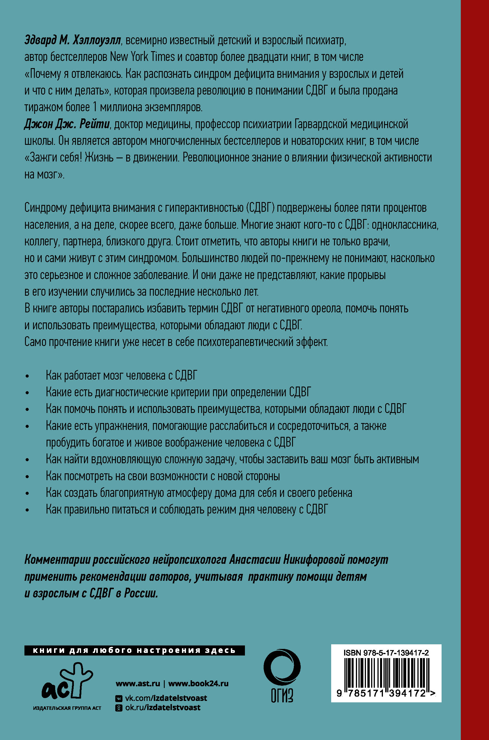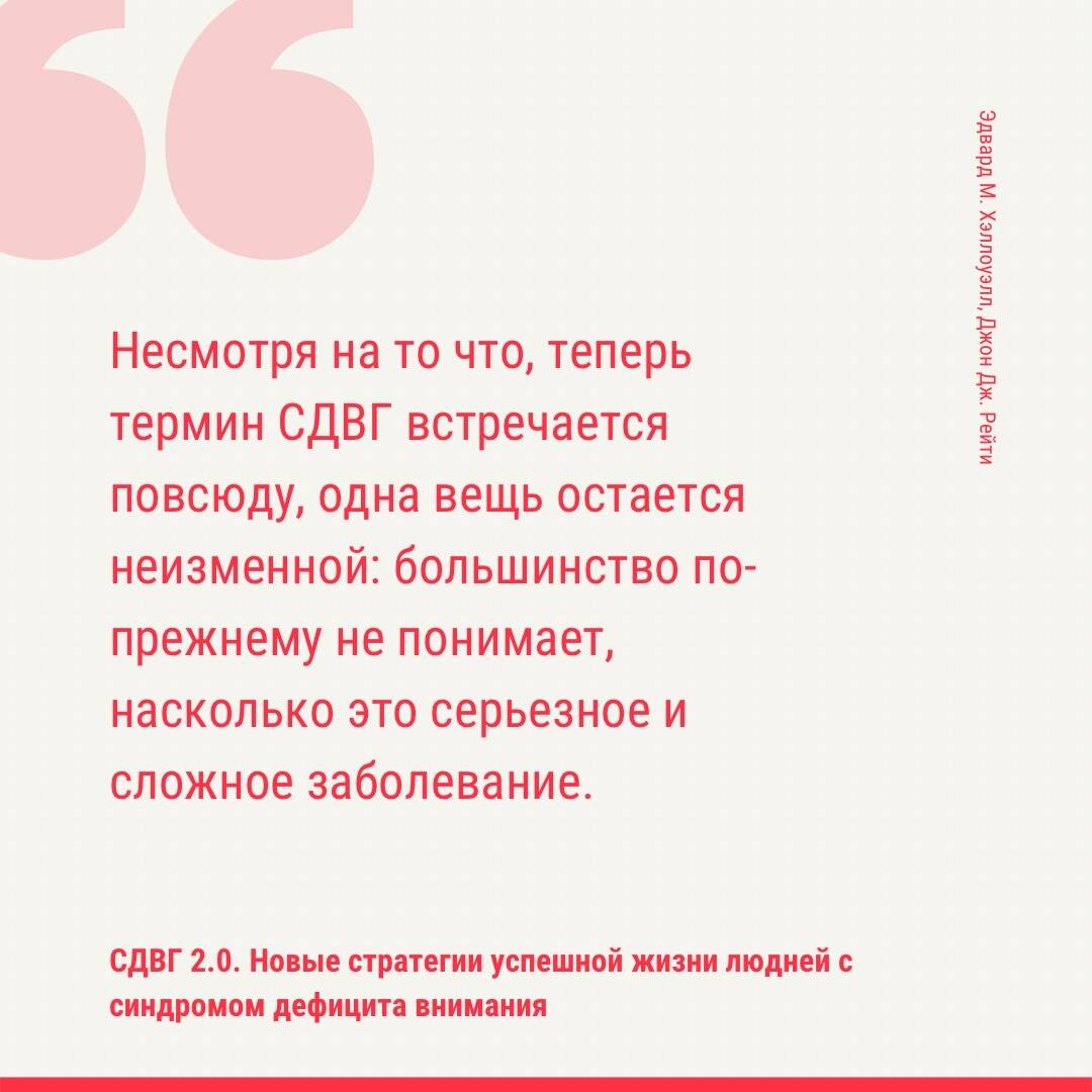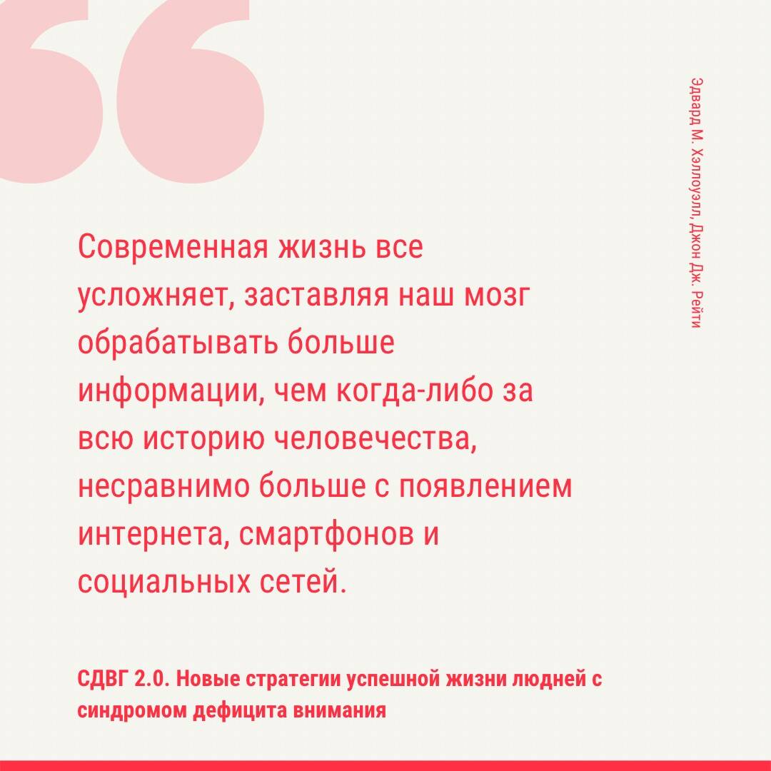 «СДВГ 2.0. Новые стратегии успешной жизни людей с синдромом дефицита внимания» - книга, которая адресована тем, кто хотя бы раз задумывался «Возможно, у меня СДВГ?», тем, кто знает о своем синдроме, а также родителям, партнерам и близким людей с СДВГ. Книга будет интересна врачам, психологам и педагогам, работающим как с детьми, так и со взрослыми с синдромом дефицита внимания. Примечательно, что авторы книги - знаменитые американские психиатры Эдвард М. Хэллоуэлл и Джон Дж. Рейти - сами живут с СДВГ и знают о недуге не понаслышке. Читатели узнают данные новейших научных исследований, получат необходимую информацию о том, как работает наш мозг, как устроены виды медикаментозного лечения и психотерапии, а также - практические рекомендации.