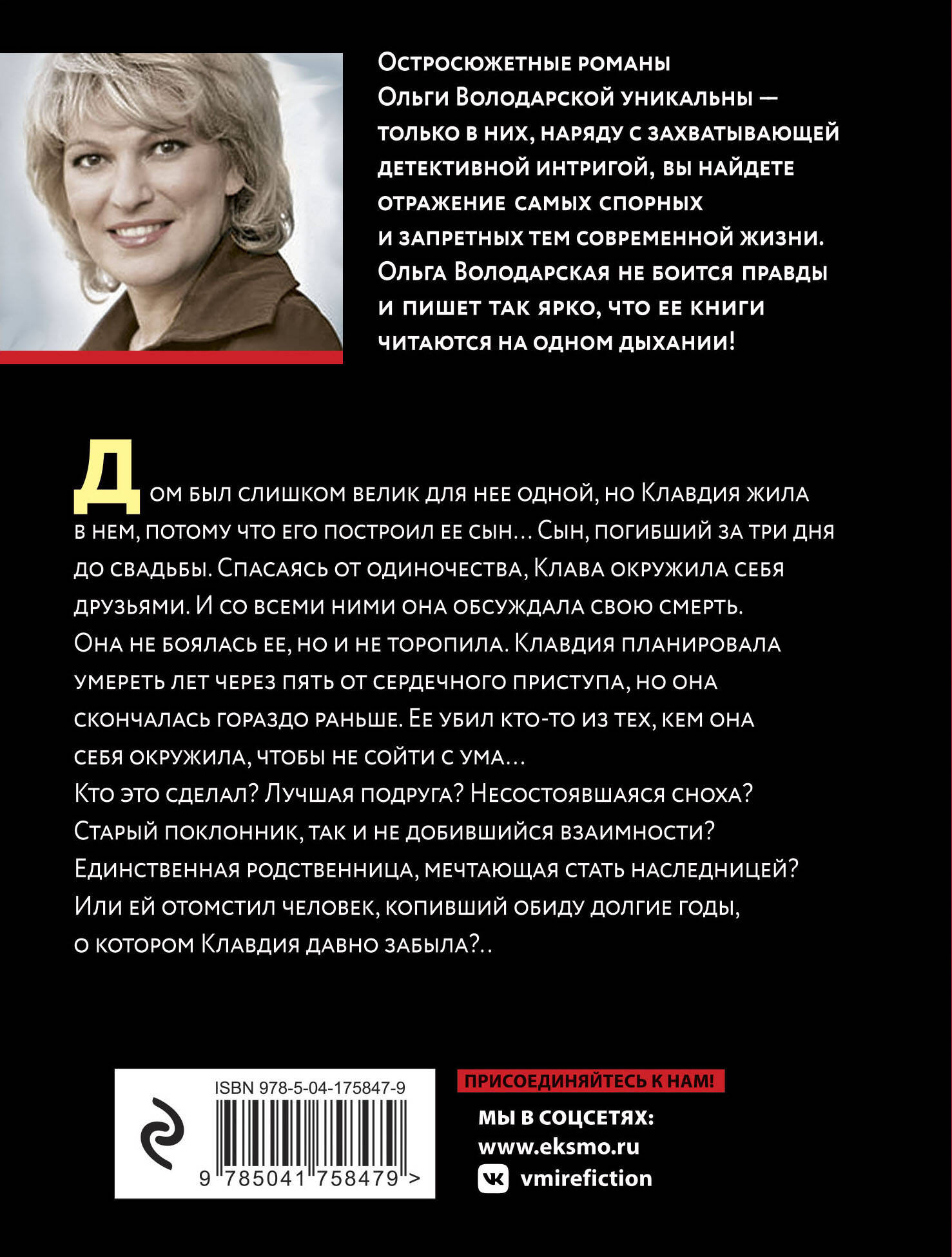 Романы Ольги Володарской - остросоциальные детективы, в которых автор препарирует все стороны жизни современного общества, ничего не скрывая и ни о чем не умалчивая. Ее книги написаны так увлекательно, что оторваться просто невозможно. Яркий сочный язык и блестящий авторский стиль создают неповторимую атмосферу, в которую с головой погружается читатель.
