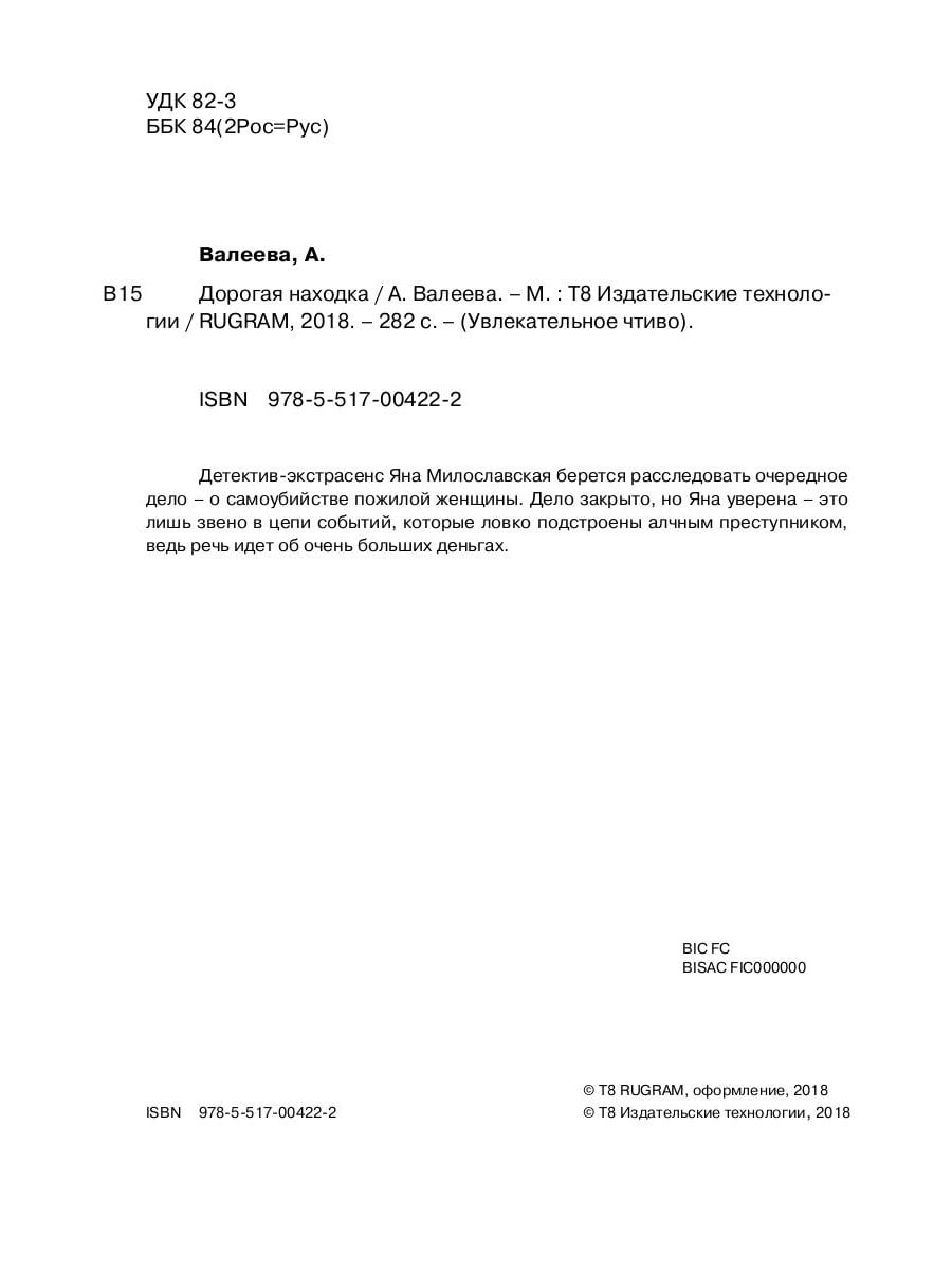 Детектив-экстрасенс Яна Милославская берется расследовать очередное дело - о самоубийстве пожилой женщины. Дело закрыто, но Яна уверена - это лишь звено в цепи событий, которые ловко подстроены алчным преступником, ведь речь идет об очень больших деньгах.| Издательство | Т8 RUGRAM |
