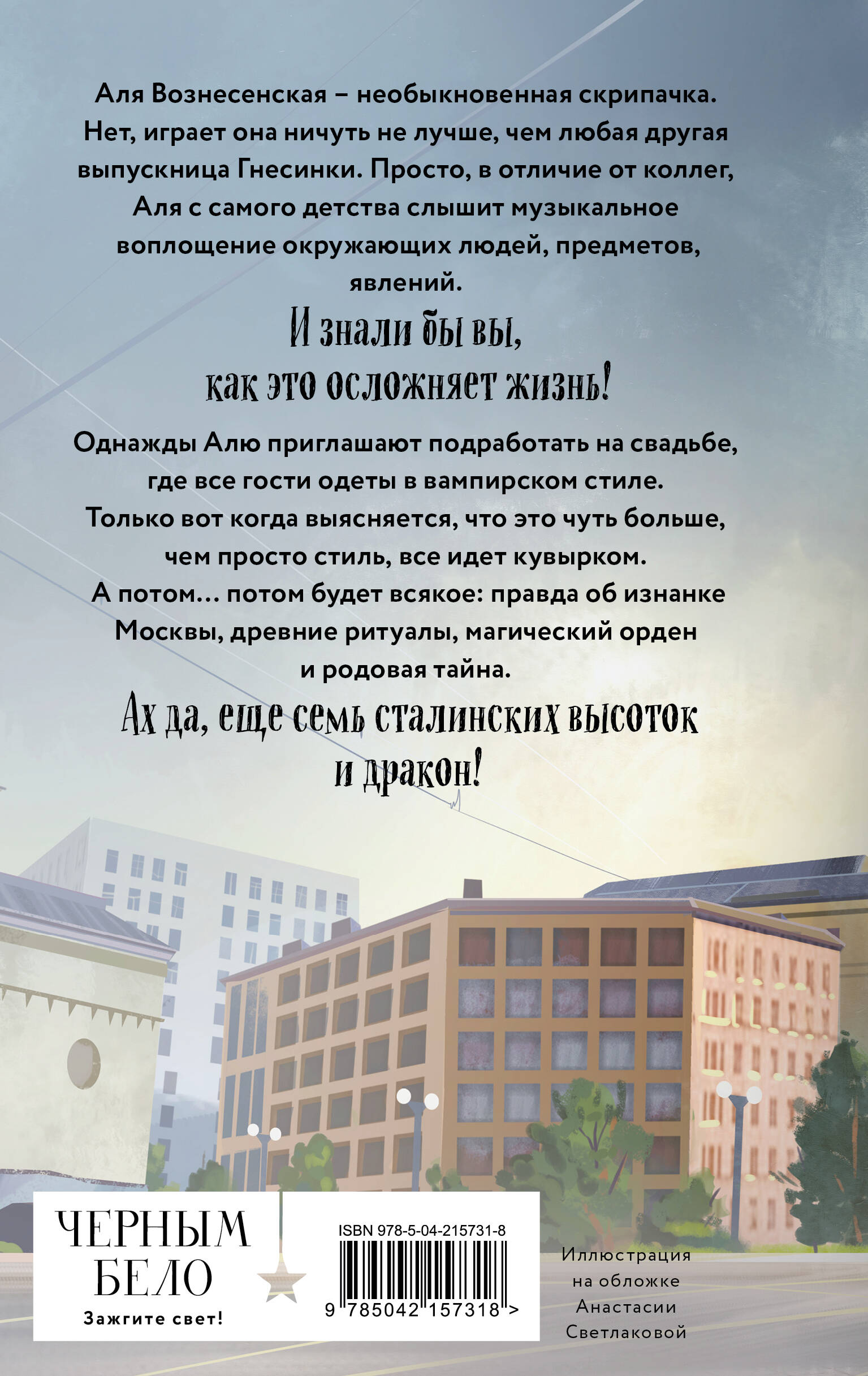 Аля Вознесенская - необыкновенная скрипачка. Нет, играет она ничуть не лучше, чем любая другая выпускница Гнесинки. Просто, в отличие от коллег, Аля с самого детства слышит музыкальное воплощение окружающих людей, предметов, явлений. И знали бы вы, как это осложняет жизнь! Однажды Алю приглашают подработать на свадьбе, где все гости одеты в вампирском стиле. Только вот когда выясняется, что это чуть больше, чем просто стиль, все идет кувырком. А потом… потом будет всякое: правда об изнанке Москвы, древние ритуалы, магический орден и родовая тайна. Ах да, еще семь сталинских высоток и дракон!| Издательство | ООО "Издательство "Эксмо" |