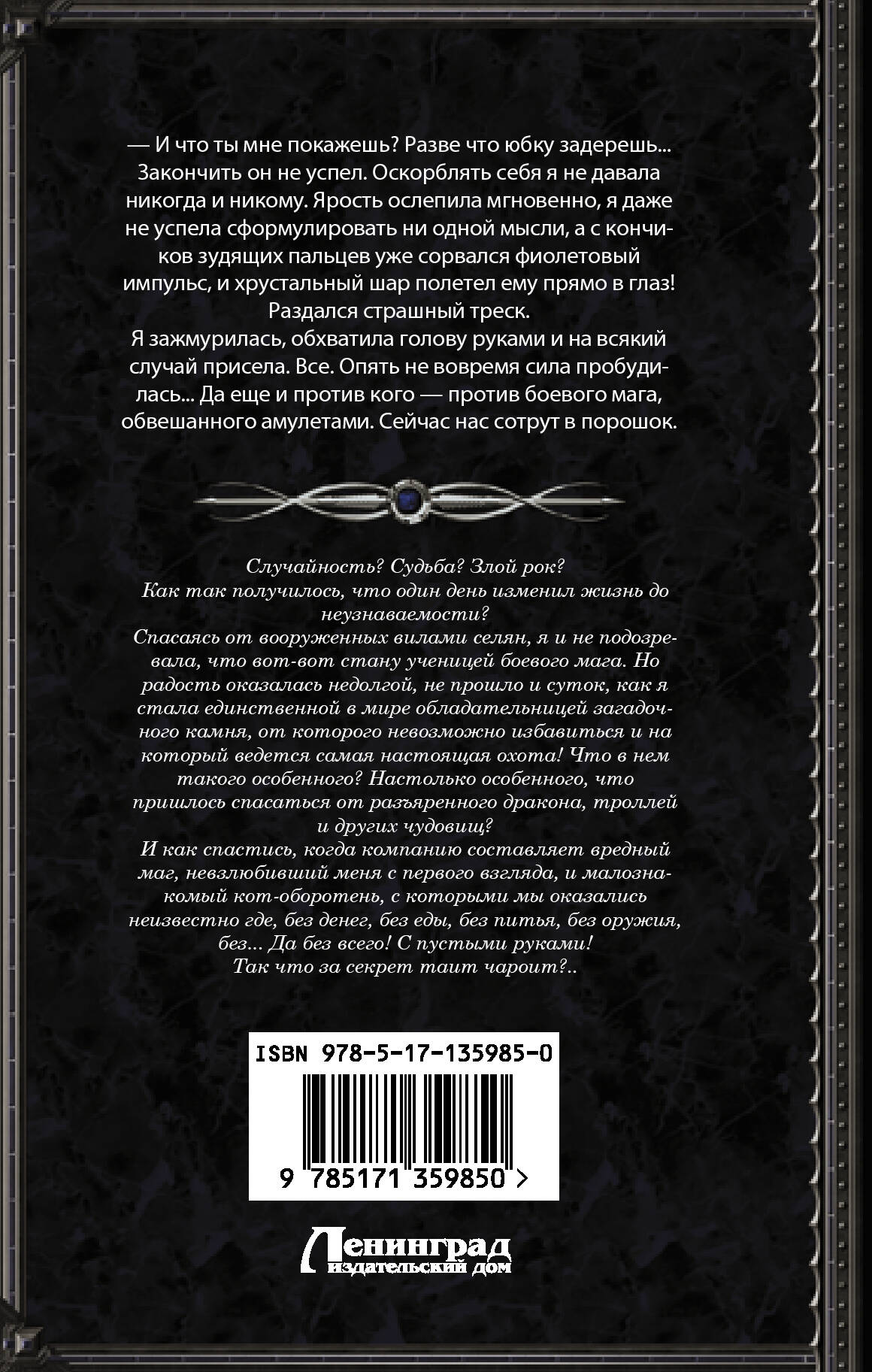 Случайность? Судьба? Злой рок? Как так получилось, что один день изменил жизнь до неузнаваемости? Спасаясь от вооруженных вилами селян, я и не подозревала, что вот-вот стану ученицей боевого мага. Но радость оказалась недолгой, не прошло и суток, как я стала единственной в мире обладательницей загадочного камня, от которого невозможно избавиться и на который ведется самая настоящая охота! Что в нем такого особенного? Настолько особенного, что пришлось спасаться от разъяренного дракона, троллей и других чудовищ? И как спастись, когда компанию составляет вредный маг, невзлюбивший меня с первого взгляда, и малознакомый кот-оборотень, с которыми мы оказались неизвестно где, без денег, без еды, без питья, без оружия, без... Да без всего! С пустыми руками! Так что за секрет таит чароит?..