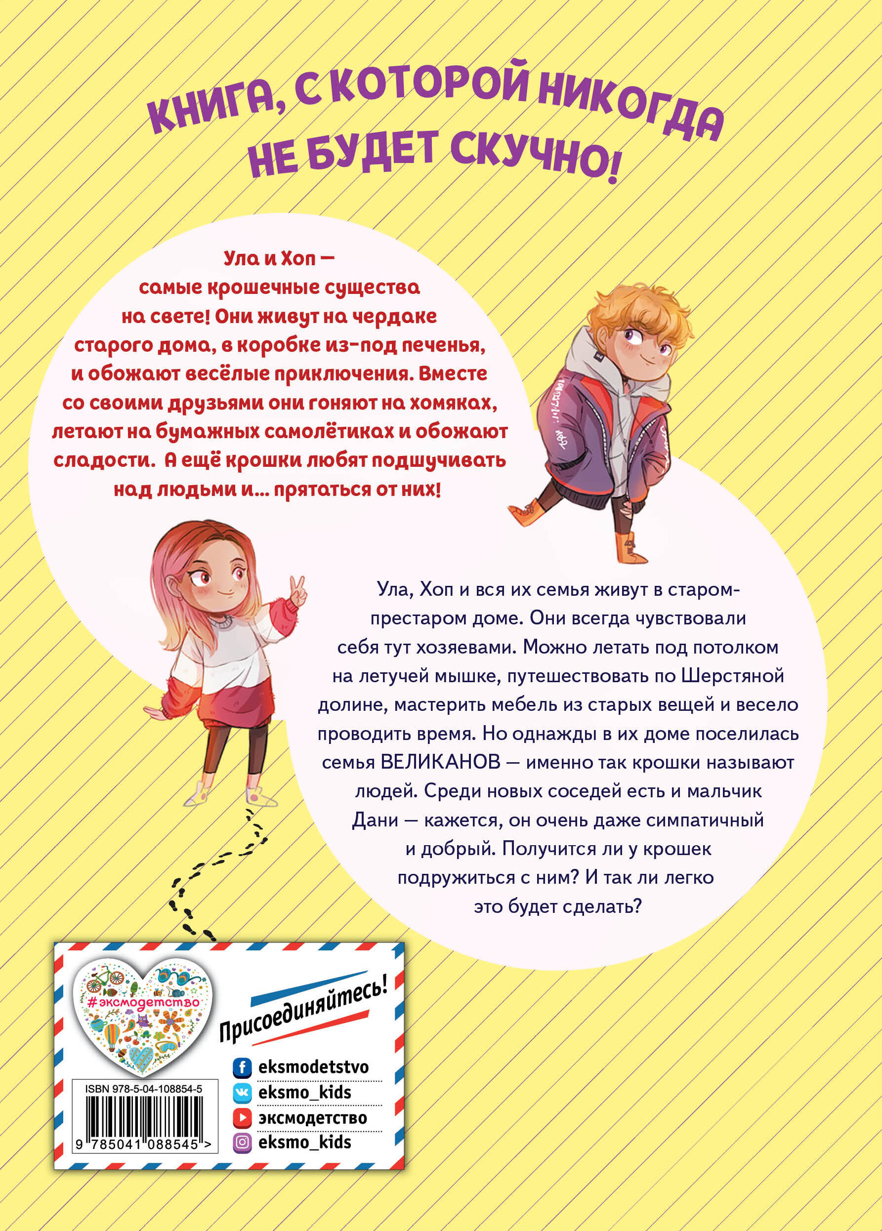 Ула и Хоп - самые крошечные существа на свете! Вместе со своей семьёй они живут в старом доме, в коробке из-под печенья. Как же тут здорово! Можно летать на летучей мышке под самым потолком, веселиться и устраивать разные проказы. Но однажды в доме крошек поселилась семья ВЕЛИКАНОВ - именно так они называют людей. Ой-ой, что же теперь делать?! Ведь люди ни в коем случае не должны их заметить! Получится ли у крошек ужиться с новыми соседями? И легко ли это будет сделать? Невероятно весёлые приключения самых крошечных человечков - читать будет о-очень интересно! Отличное настроение обеспечено! Книга написана с юмором и очень легко. Красивые яркие иллюстрации на каждой странице, крупный шрифт, плотная бумага и удобный формат делают её просто идеальной для самостоятельного чтения! Особенно понравится поклонникам серии «Изадора Мун».| Издательство | ООО "Издательство "Эксмо" |