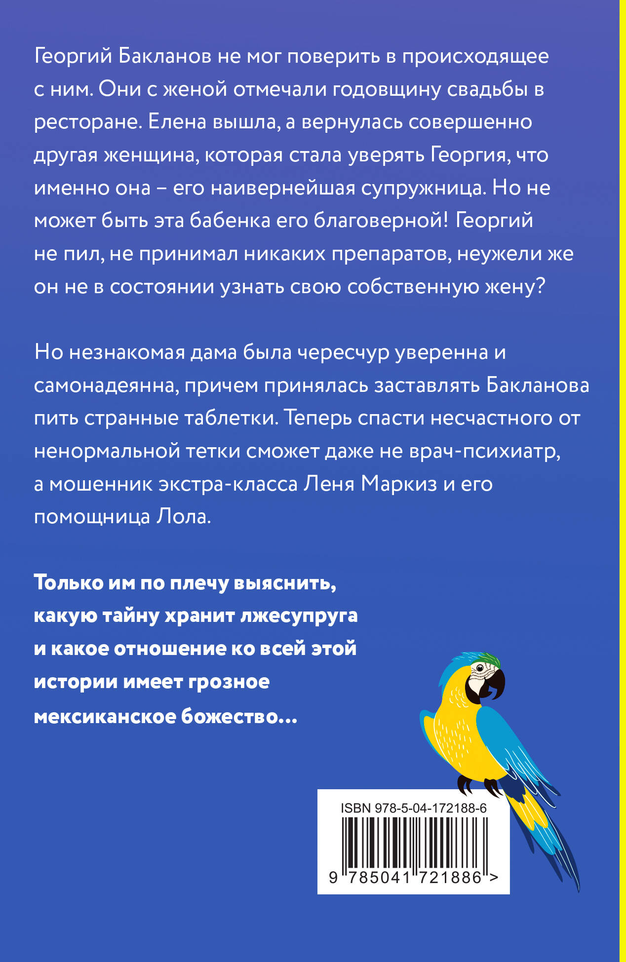 Георгий Бакланов не мог поверить в происходящее с ним. Они с женой отмечали годовщину свадьбы в ресторане. Елена вышла, а вернулась совершенно другая женщина, которая стала уверять Георгия, что именно она - его наивернейшая супружница. Но не может быть эта бабенка его благоверной! Георгий не пил, не принимал никаких препаратов, неужели же он не в состоянии узнать свою собственную жену? Но незнакомая дама была чересчур уверена и самонадеянна, причем принялась заставлять Бакланова пить странные таблетки. Теперь спасти несчастного от ненормальной тетки сможет даже не врач-психиатр, а мошенник экстра-класса Леня Маркиз и его помощница Лола. Только им по плечу выяснить, какую тайну хранит лже-супруга и какое отношение ко всей этой истории имеет грозное мексиканское божество… Наталья Александрова имеет редкий дар видеть смешное и удивительное в обыденном. Ее герои колоритны и обаятельны, а сюжет забавен и непредсказуем. Великолепный легкий образный язык и неповторимый стиль привлекают ценителей детективного жанра. Романы Натальи Александровой переведены на многие европейские языки.| Издательство | ООО "Издательство "Эксмо" |