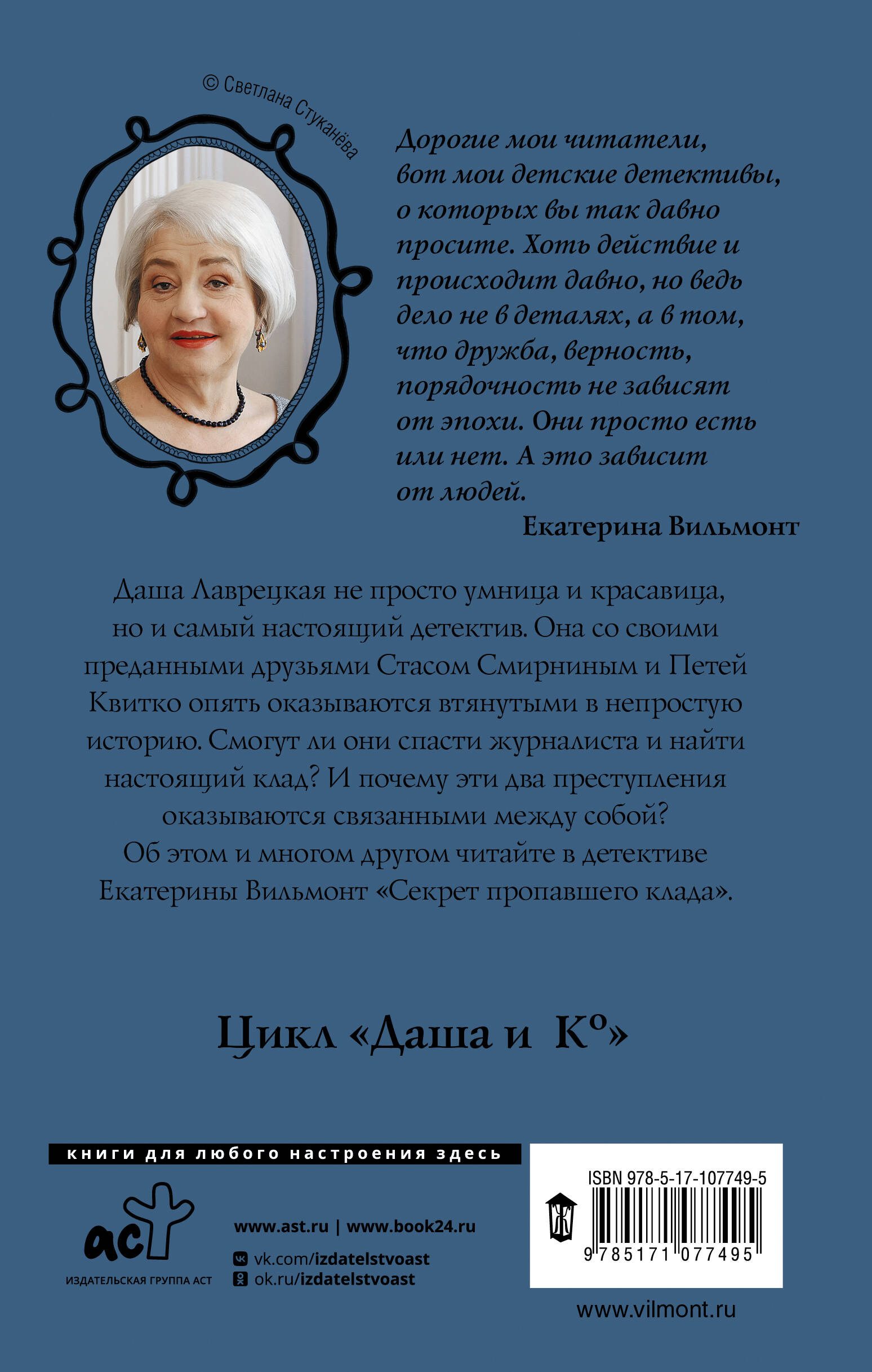 Даша Лаврецкая не просто умница и красавица, но и самый настоящий детектив. Она со своими преданными друзьями Стасом Смирниным и Петей Квитко опять оказываются в тянутыми в непростую историю. Смогут ли они спасти журналиста и найти настоящий клад? И почему эти два преступления оказываются связанными между собой? об этом и многом другом читайте в детективе Екатерины Вильмонт "Секрет пропавшего клада".| Издательство | ИЗДАТЕЛЬСТВО "АСТ" |