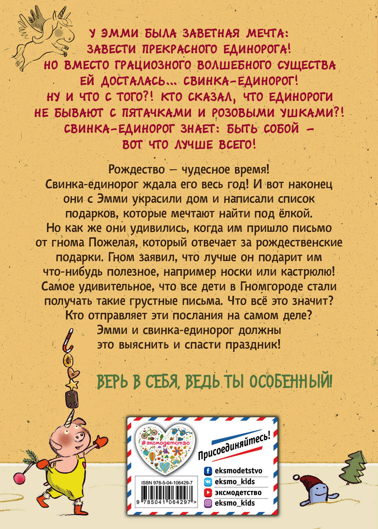Свинка-единорог с нетерпением ждала своё первое Рождество! Вместе с Эмми они украсили дом и написали список подарков, которые мечтают найти под ёлкой. Но произошло неслыханное дело: гном Пожелай, отвечающий за рождественские подарки в Гномгороде, прислал им ужасное письмо! Пожелай пишет, что они получат другие подарки, более практичные и полезные. Самое удивительное, все дети в городе стали получать такие письма. Что же всё это значит? Неужели рождественский гном сошёл с ума? Эмми и свинка обязательно должны выяснить правду и спасти праздник! Вы полюбите очаровательную свинку-единорога с первых страниц! История о ней заставит вас громко смеяться и подарит отличное настроение! Книга поможет юному читателю поверить в себя и расскажет, как важна поддержка друзей и близких. Внутри вас ждут классные иллюстрации Сюзанны Гёлих.| Издательство | ООО "Издательство "Эксмо" |
