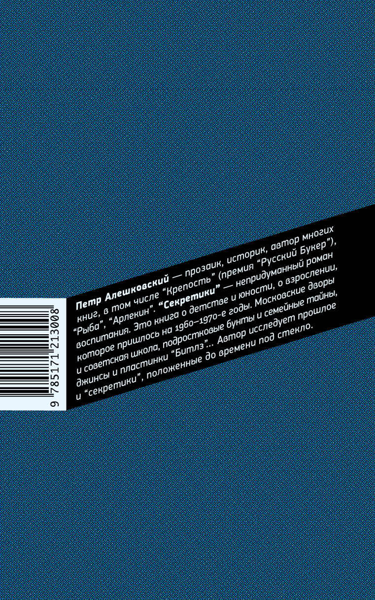 Петр Алешковский - прозаик, историк, автор многих книг, в том числе "Крепость" (премия "Русский Букер"), "Рыба", "Жизнеописание Хорька", "Арлекин". "Секретики" - непридуманный роман воспитания. Это книга о детстве и юности, о взрослении, которое пришлось на 1960-1970-е годы. Московские дворы и советская школа, подростковые бунты и семейные тайны, джинсы и пластинки "Битлз"… Автор исследует прошлое и "секретики", положенные до времени под стекло. "В детстве мы живем лишь сегодняшним днем, повзрослев, обретаем прошлое".| Издательство | Издательство "АСТ" |
