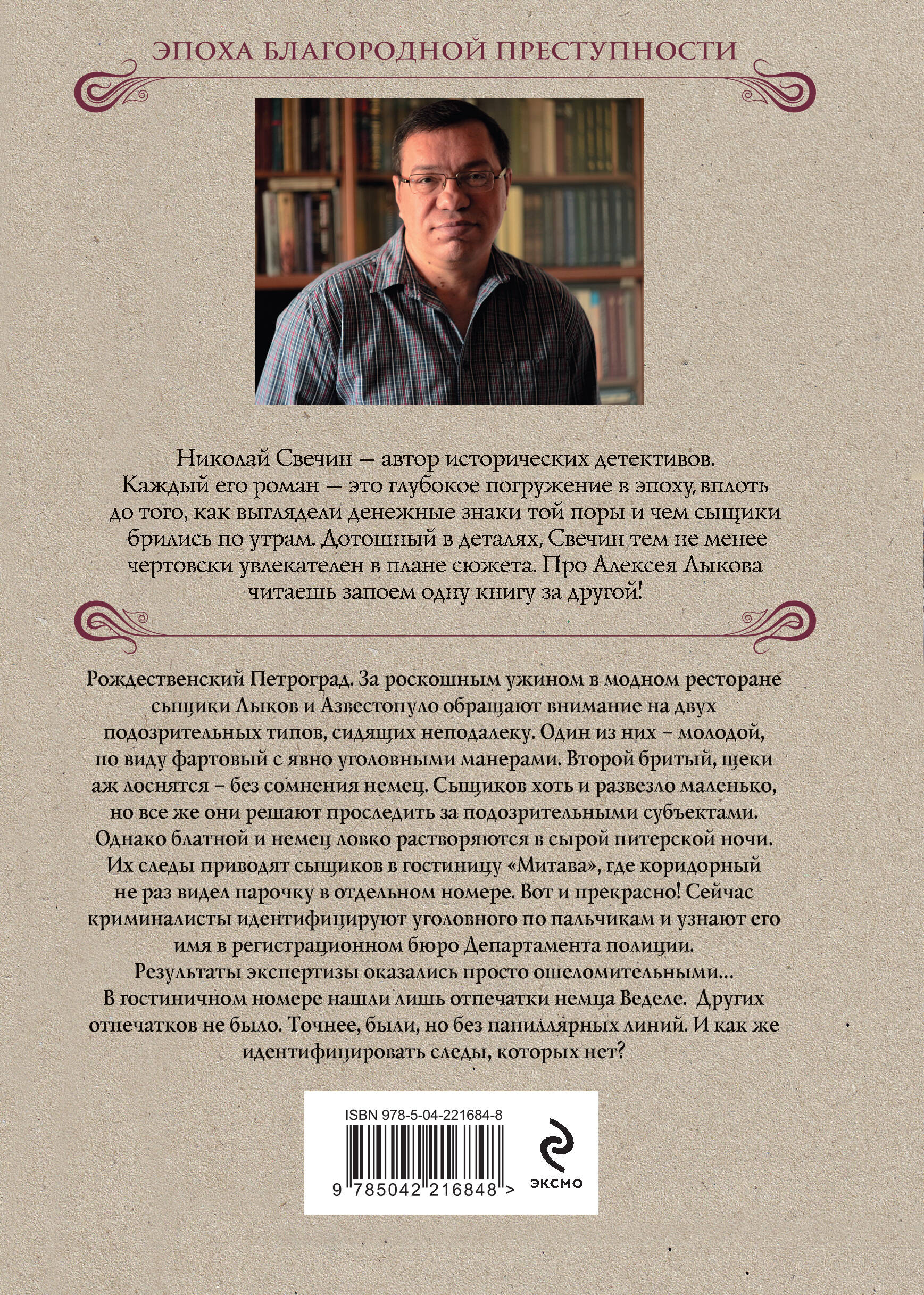 Рождественский Петроград. За роскошным ужином в модном ресторане сыщики Лыков и Азвестопуло обращают внимание на двух подозрительных типов, сидящих неподалеку. Один из них - молодой, по виду фартовый с явно уголовными манерами. Второй бритый, щеки аж лоснятся - без сомнения немец. Сыщиков хоть и развезло маленько, но все же они решают проследить за подозрительными субъектами. Однако блатной и немец ловко растворяются в сырой питерской ночи. Их следы приводят сыщиков в гостиницу «Митава», где коридорный не раз видел парочку в отдельном номере. Вот и прекрасно! Сейчас криминалисты идентифицируют уголовного по пальчикам и узнают его имя в регистрационном бюро Департамента полиции. Результаты экспертизы оказались просто ошеломительными… В гостиничном номере нашли лишь отпечатки немца Веделе. Других отпечатков не было. Точнее, были, но без папиллярных линий. И как же идентифицировать следы, которых нет? Захватывающий исторический детектив от победителя премии «Русский детектив» Николая Свечина. Роман входит в цикл произведений о сыщике Алексее Лыкове и является 38-м по счету.| Издательство | ООО "Издательство "Эксмо" |