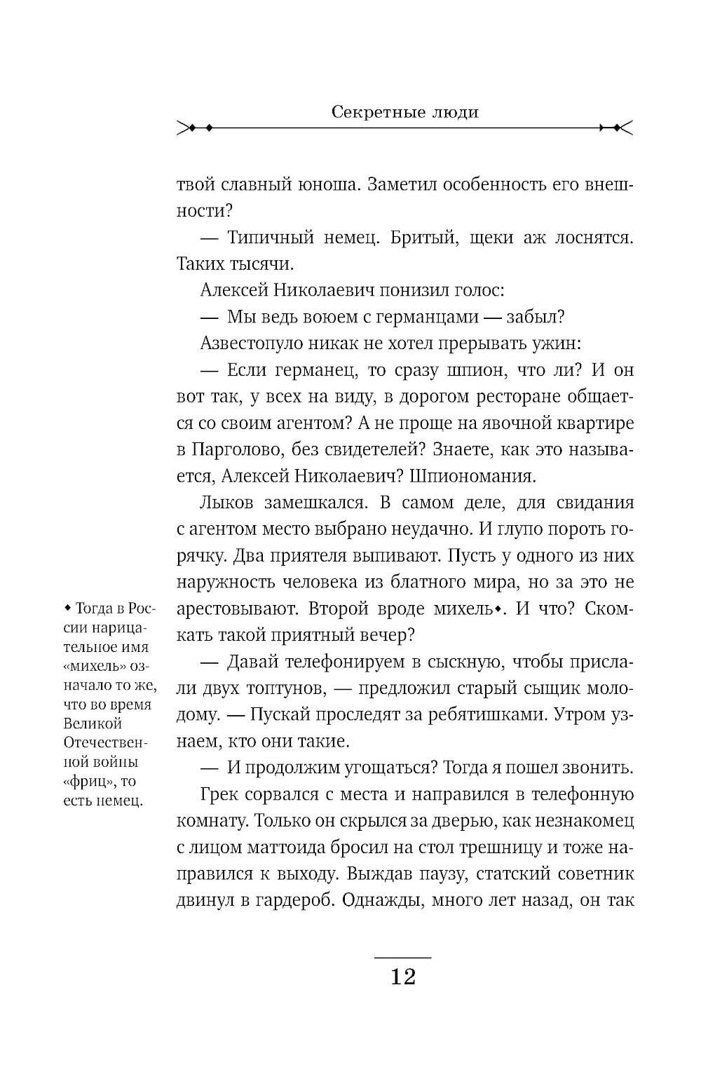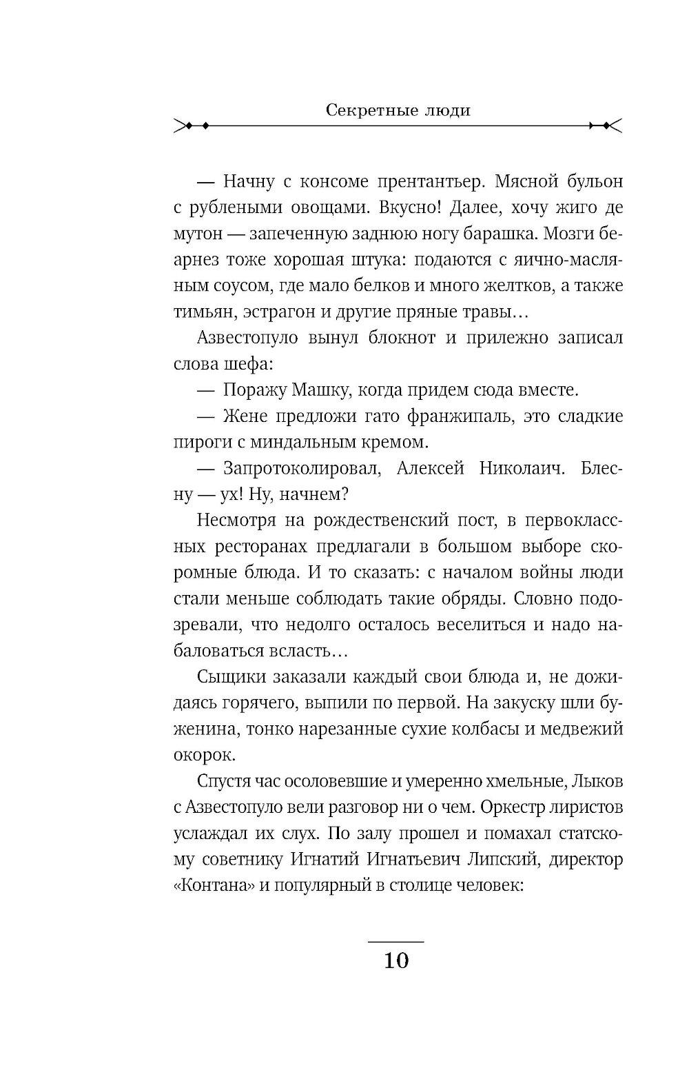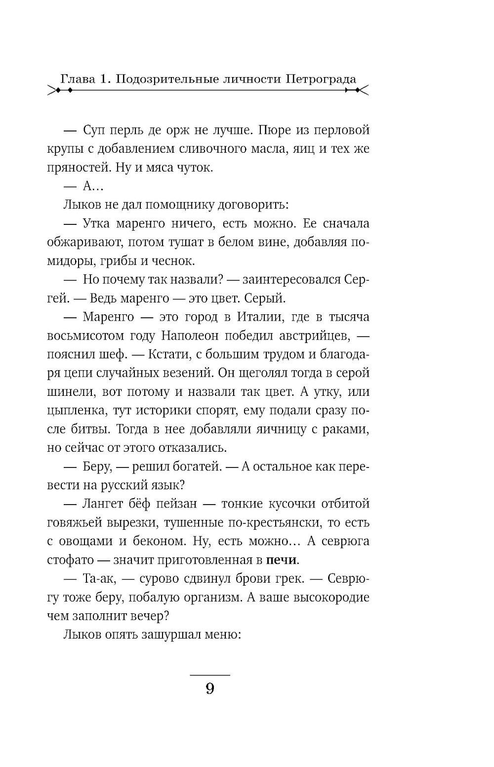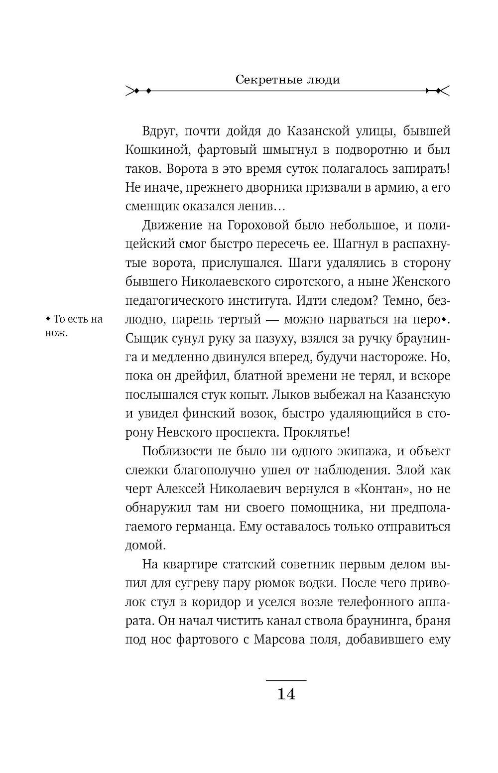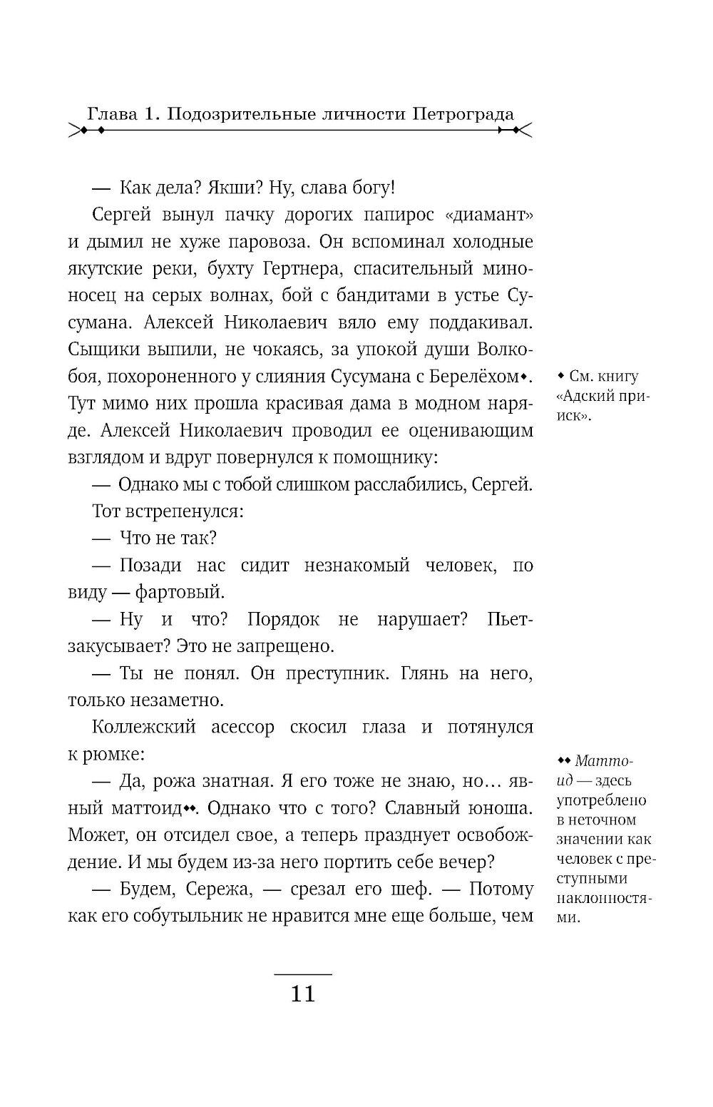 Рождественский Петроград. За роскошным ужином в модном ресторане сыщики Лыков и Азвестопуло обращают внимание на двух подозрительных типов, сидящих неподалеку. Один из них - молодой, по виду фартовый с явно уголовными манерами. Второй бритый, щеки аж лоснятся - без сомнения немец. Сыщиков хоть и развезло маленько, но все же они решают проследить за подозрительными субъектами. Однако блатной и немец ловко растворяются в сырой питерской ночи. Их следы приводят сыщиков в гостиницу «Митава», где коридорный не раз видел парочку в отдельном номере. Вот и прекрасно! Сейчас криминалисты идентифицируют уголовного по пальчикам и узнают его имя в регистрационном бюро Департамента полиции.| Издательство | Эксмо |