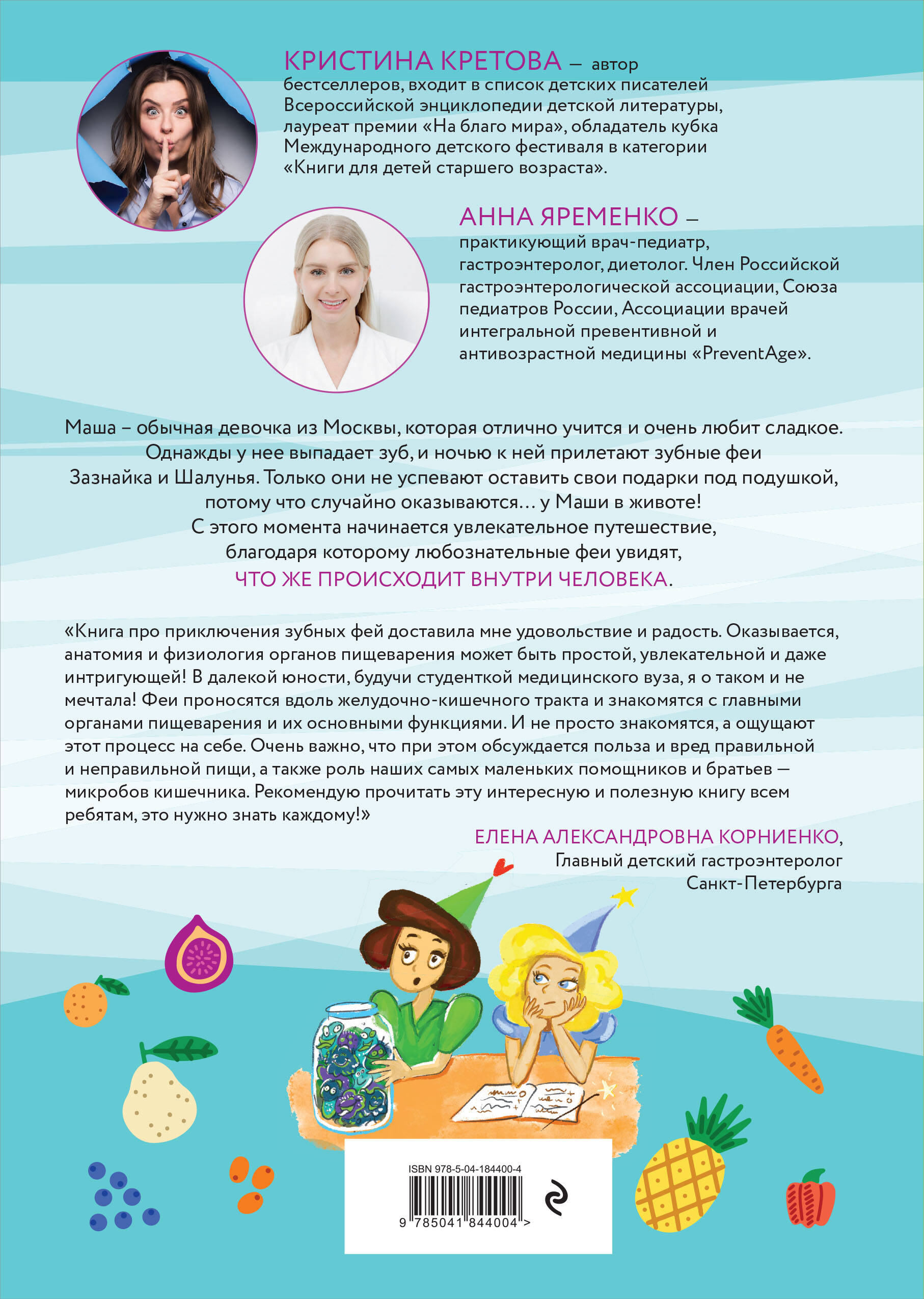Книга «Секретные секреты живота Маши» подарит маленьким читателям и их родителям незабываемое путешествие, в ходе которого они не только узнают, что происходит в их животах, но и замотивирует их есть более здоровую пишу. Она написана писательницей Кристиной Кретовой и детским гастроэнтерологом Анной Яременко. Какой путь проходит еда при попадании в рот? Зачем в кишечнике живут бактерии? Почему может болеть живот? Что будет, если есть слишком много конфет? Что будет, если проглотить двух волшебных фей? «Книга про приключения зубных фей доставила мне удовольствие и радость. Оказывается, анатомия и физиология органов пищеварения может быть простой, увлекательной и даже интригующей! В далекой юности, будучи студенткой медицинского ВУЗа, я о таком и не мечтала! Феи проносятся вдоль желудочно-кишечного тракта и знакомятся с главными органами пищеварения и их основными функциями. И не просто знакомятся, а ощущают этот процесс на себе. Очень важно, что при этом обсуждается польза и вред правильной и неправильной пищи, а также роль наших самых маленьких помощников и братьев - микробов кишечника. Рекомендую прочитать эту интересную и полезную книгу всем ребятам, это нужно знать каждому!» ЕЛЕНА АЛЕКСАНДРОВНА КОРНИЕНКО, главный детский гастроэнтеролог Санкт-Петербурга| Издательство | ООО "Издательство "Эксмо" |