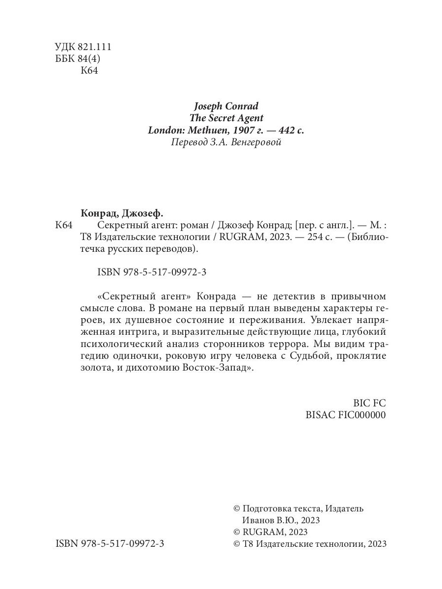 «Секретный агент» Конрада - не детектив в привычном смысле слова. В романе на первый план выведены характеры героев, их душевное состояние и переживания. Увлекает напряженная интрига, и выразительные действующие лица, глубокий психологический анализ сторонников террора. Мы видим трагедию одиночки, роковую игру человека с Судьбой, проклятие золота, и дихотомию Восток-Запад.| Издательство | Т8 RUGRAM |