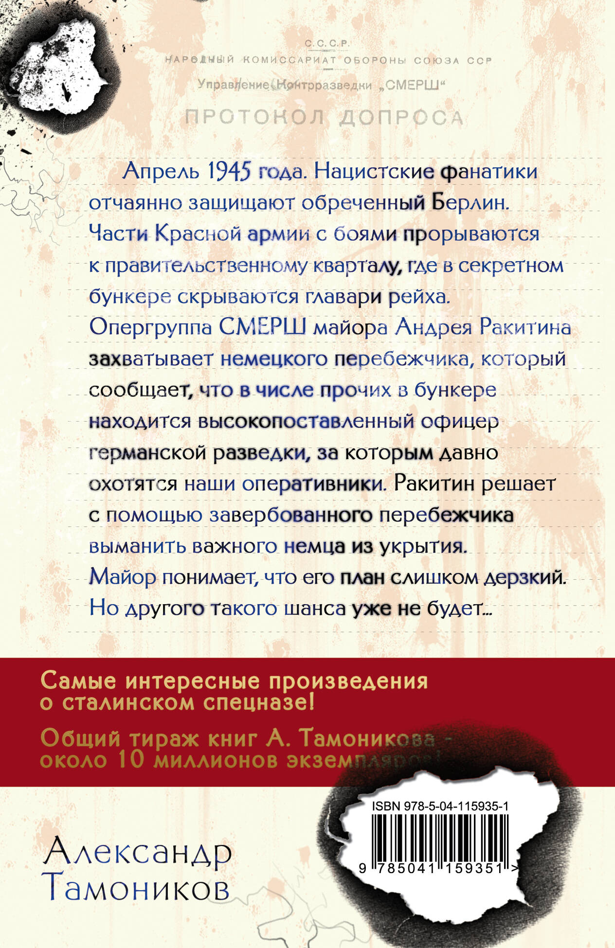 Самые интересные произведения о сталинском спецназе! Общий тираж книг А. Тамоникова - около 10 миллионов экземпляров! Апрель 1945 года. Нацистские фанатики отчаянно защищают обреченный Берлин. Части Красной Армии с боями прорываются к правительственному кварталу, где в секретном бункере скрываются главари рейха. Опергруппа СМЕРШ майора Андрея Ракитина захватывает немецкого перебежчика, который сообщает, что в числе прочих в бункере находится высокопоставленный офицер германской разведки, за которым давно охотятся наши оперативники. Ракитин решает с помощью завербованного перебежчика выманить важного немца из укрытия. Майор понимает, что его план слишком дерзкий. Но другого такого шанса уже не будет…| Издательство | ООО "Издательство "Эксмо" |