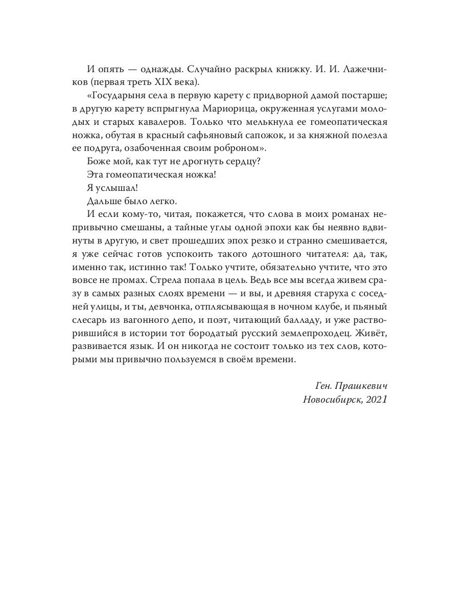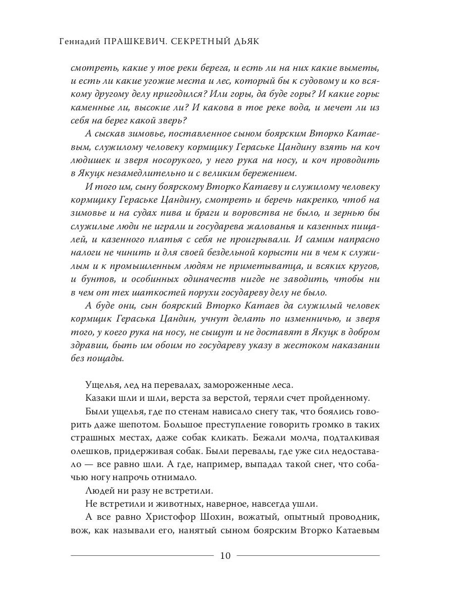 Романы Геннадия Прашкевича можно сравнить с музыкальными произведениями, так необычен ритм его прозы, так самобытен и глобален язык, - отзывались о «Секретном дьяке» и «Носоруком» литературные критики. Гул прошлого явственно доносится до наших дней. Только-только ещё задуман выход к Тихому океану, а приказной дьяк Иван Крестинин со товарищи уже идёт по бескрайним снегам Сибири, преодолевает громадные пространства, освещаемые лишь луной да северными сияниями, слышат гортанные голоса населяющих приполярный круг разноязычных племён; казалось бы, самые обыденные события становятся Историей. «Только что закончил (читать) «Секретного дьяка», - писал автору, прочитав книгу, Борис Стругацкий. - Отличная вещь! Вы один из поистине немногих в нынешней России, кто умеет писать исторические романы!»