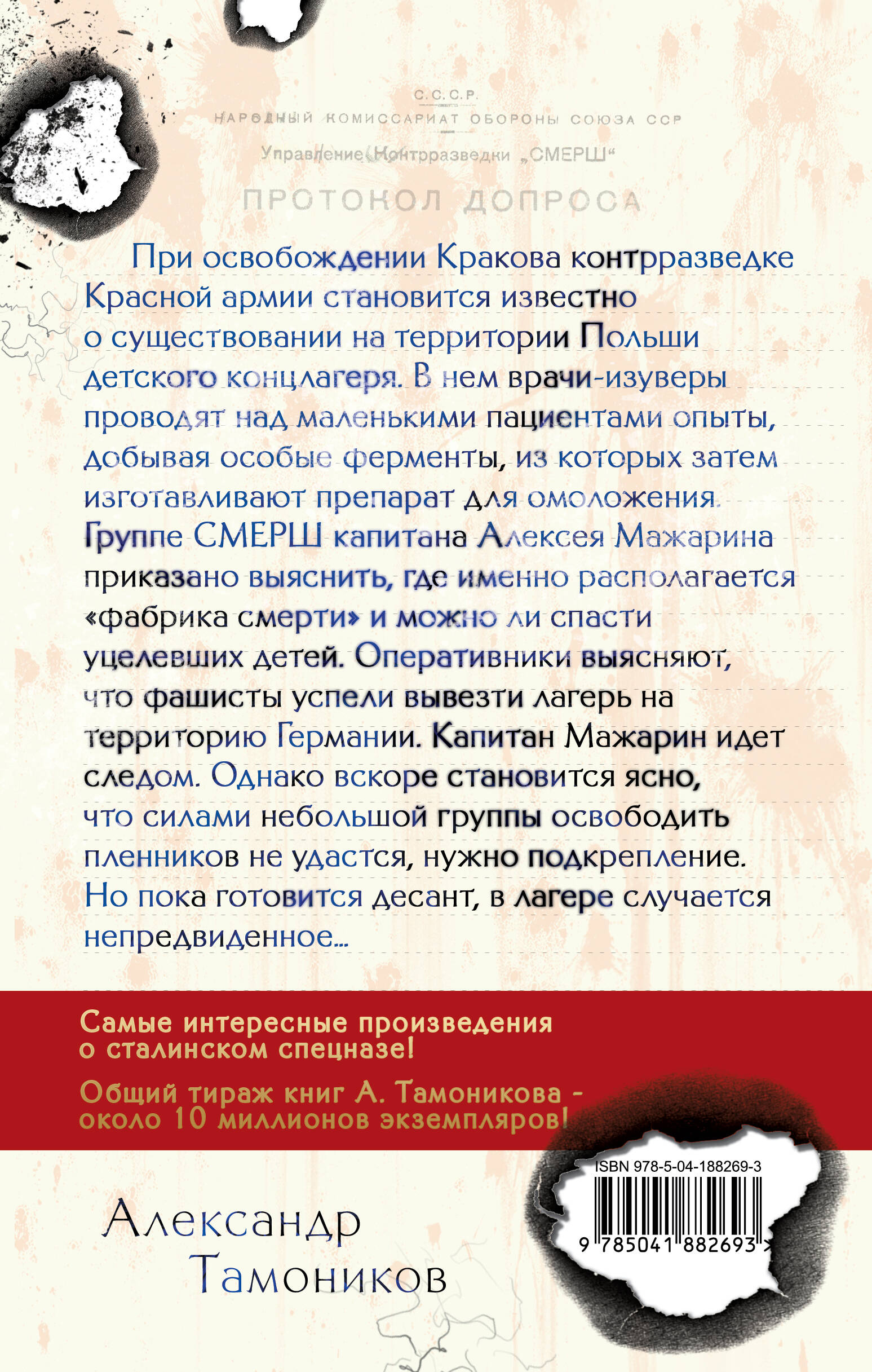 Самые интересные романы о сталинском спецназе - СМЕРШе. При освобождении Кракова контрразведке Красной Армии становится известно о существовании на территории Польши детского концлагеря. В нем врачи-изуверы проводят над маленькими пациентами опыты, добывая особые ферменты, из которых затем изготавливают препарат для омоложения. Группе СМЕРШа капитана Алексея Мажарина приказано выяснить, где именно располагается «фабрика смерти» и можно ли спасти уцелевших детей. Оперативники выясняют, что фашисты успели вывезти лагерь на территорию Германии. Капитан Мажарин идет следом. Однако вскоре становится ясно, что силами небольшой группы освободить пленников не удастся, нужно подкрепление. Но пока готовится десант, в лагере случается непредвиденное… «Смерть шпионам!» (СМЕРШ) - это короткое и беспощадное название носило особое подразделение НКВД, подчинявшееся И. Сталину. Созданное в годы войны, оно состояло из проверенных в бою, честных и бесстрашных офицеров Красной Армии. СМЕРШа боялись все - и фашистские лазутчики, готовящие диверсии в наших боевых порядках, и гитлеровские приспешники, действующие в глубоком советском тылу. Враг знал: если на его след напали бойцы сталинского спецназа, справедливого и скорого суда не избежать. Романы серии «СМЕРШ - спецназ Сталина» - это каждый раз увлекательный динамичный сюжет и новые исторические знания, это экшен, написанный простым и понятным языком. Общий тираж книг А. Тамоникова - более 10 миллионов экземпляров!| Издательство | ООО "Издательство "Эксмо" |