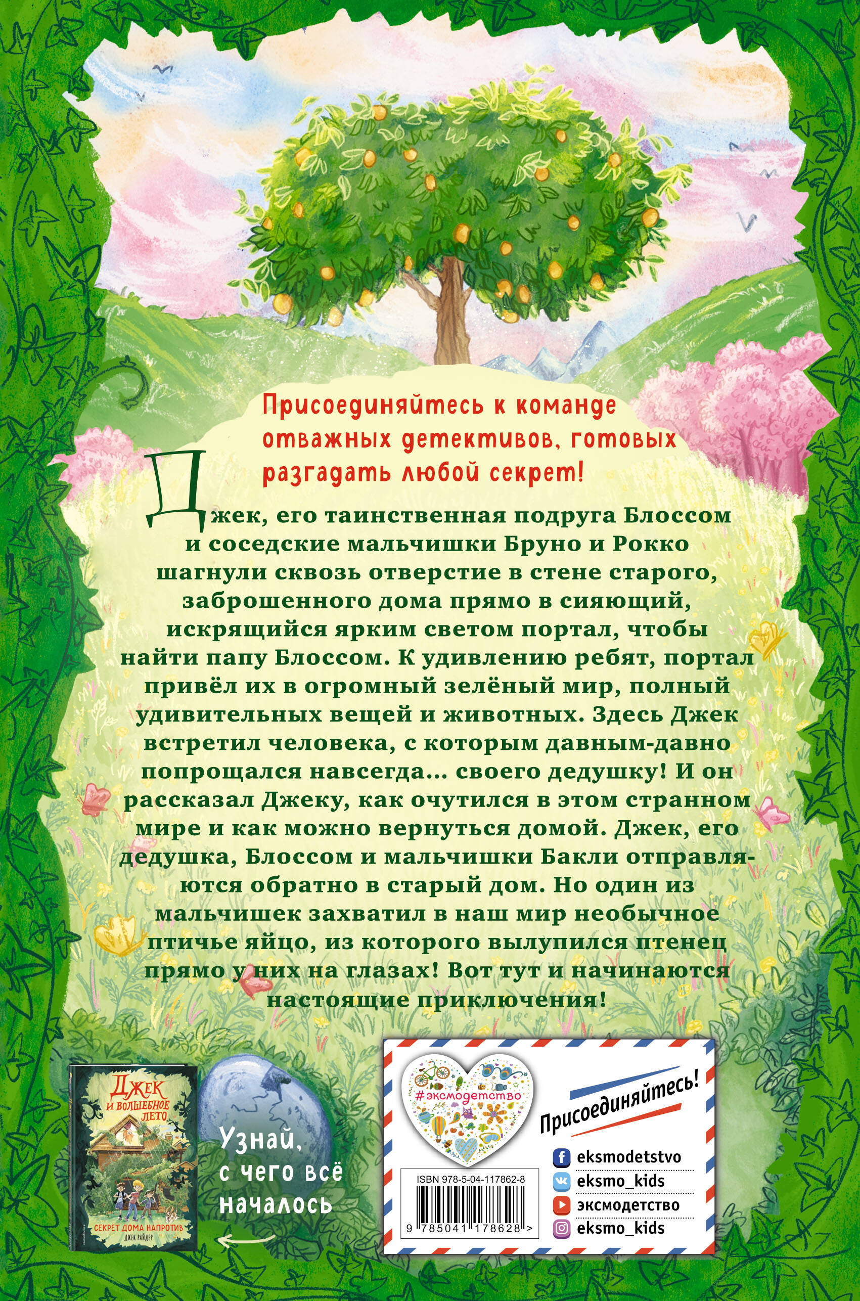 Несколько дней назад, в самом начале летних каникул, Джек решает вместе с друзьями осмотреть старый, заросший плющом дом на холме, и… приключения начинаются! Джек, его таинственная подруга Блоссом и соседские мальчишки Бруно и Рокко шагнули сквозь отверстие в стене старого, заброшенного дома прямо в сияющий, искрящийся ярким светом портал, чтобы найти папу Блоссом. Портал привёл их в огромный зелёный мир, полный удивительных вещей и животных. Здесь Джек встретил человека, с которым давным-давно попрощался навсегда… своего дедушку! И он рассказал Джеку, как очутился в этом странном мире и как можно вернуться домой. Джек, его дедушка, Блоссом и мальчишки Бакли отправляются обратно в старый дом. Но один из мальчишек захватил в наш мир необычное птичье яйцо, из которого вылупился птенец прямо у них на глазах! Очень увлекательная история, полная магии, шуток, дружбы! Яркая обложка, крупный шрифт, красивые чёрно-белые иллюстрации внутри - вам понравится. Отличное настроение гарантируем!| Издательство | ООО "Издательство "Эксмо" |