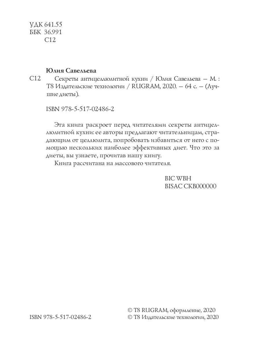 Эта книга раскроет перед читателями секреты антицеллюлитной кухни: ее авторы предлагают читательницам, страдающим от целлюлита, попробовать избавиться от него с помощью нескольких наиболее эффективных диет. Что это за диеты, вы узнаете, прочитав нашу книгу. Книга рассчитана на массового читателя.| Издательство | Т8 RUGRAM |