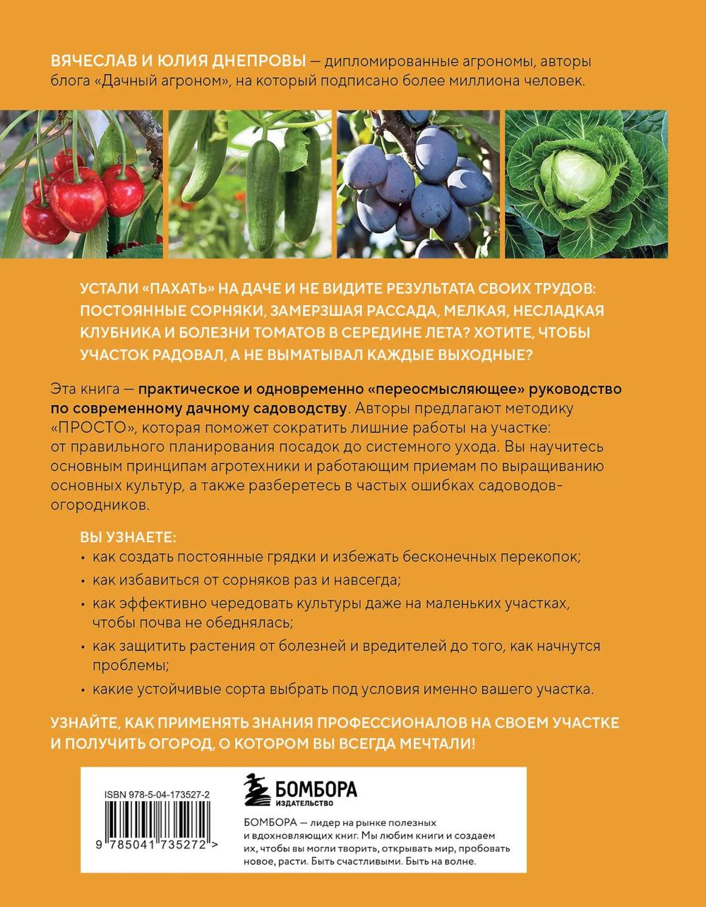 Устали «пахать» на даче и не видеть результата? Сорняки наступают, рассада мёрзнет, клубника кислая, а томаты болеют к середине лета? Пора менять подход! Эта книга - практическое и одновременно «переосмысляющее» руководство по современному дачному садоводству. Вячеслав и Юлия Днепровы - дипломированные агрономы и авторы блога «Дачный агроном» с аудиторией более миллиона подписчиков - собрали в этой книге понятную систему, которая приводит к урожаю без изнурительного труда. Методика «ПРОСТО» поможет сократить лишние работы на участке: от правильного планирования посадок до системного ухода. Вы научитесь основным принципам агротехники и работающим приемам по выращиванию основных культур, а также разберетесь в частых ошибках садоводов-огородников.| Издательство | Эксмо |