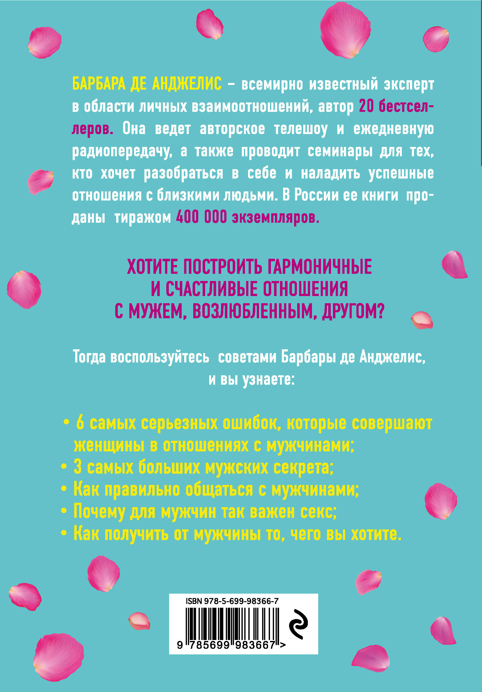 Об авторе Барбара де Анджелис - один из самых популярных в мире экспертов по отношениям и автор более чем 20 бестселлеров. Она ведет авторское телешоу и ежедневную радиопередачу, а также проводит семинары для тех, кто хочет разобраться в себе и наладить успешные отношения с близкими людьми. В России ее книги разошлись тиражом около 400 000 экземпляров. «Секреты о мужчинах, которые должны знать каждая женщина» - для тех, кто понимает, что во многом от них зависит, какими будут отношения с партнером. Что вы узнаете из этой книги: - Шесть самых серьезных ошибок, которые совершают женщины в отношениях с мужчинами. - Три самых больших мужских секрета. - Как правильно общаться с мужчинами. - Почему для мужчин так важен секс. - Как получить от мужчины то, чего вы хотите (пожалуй, это самое главное!).| Издательство | ООО "Издательство "Эксмо" |