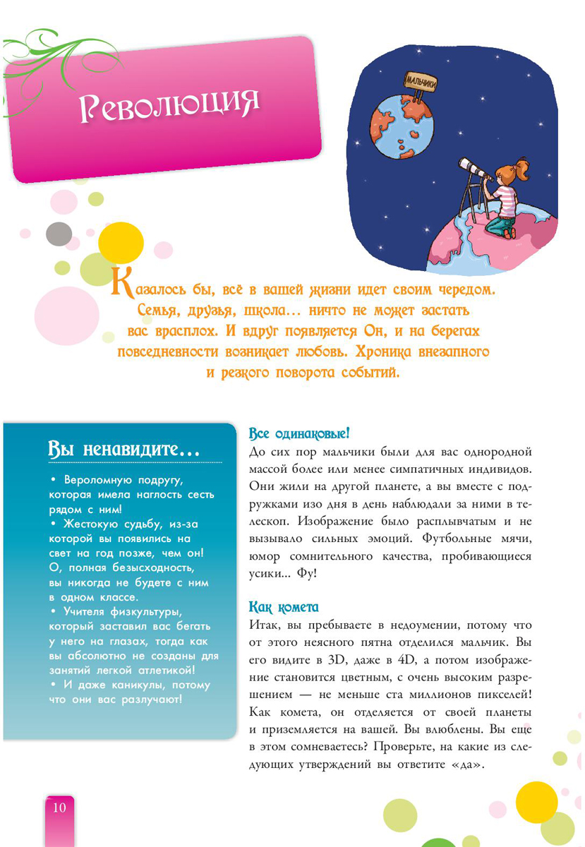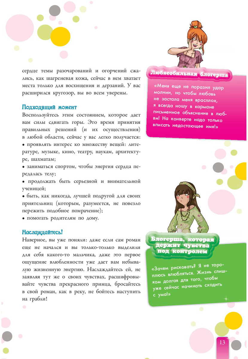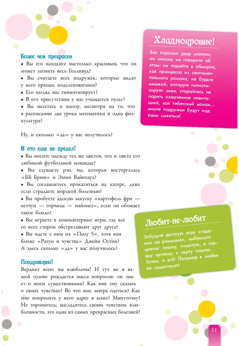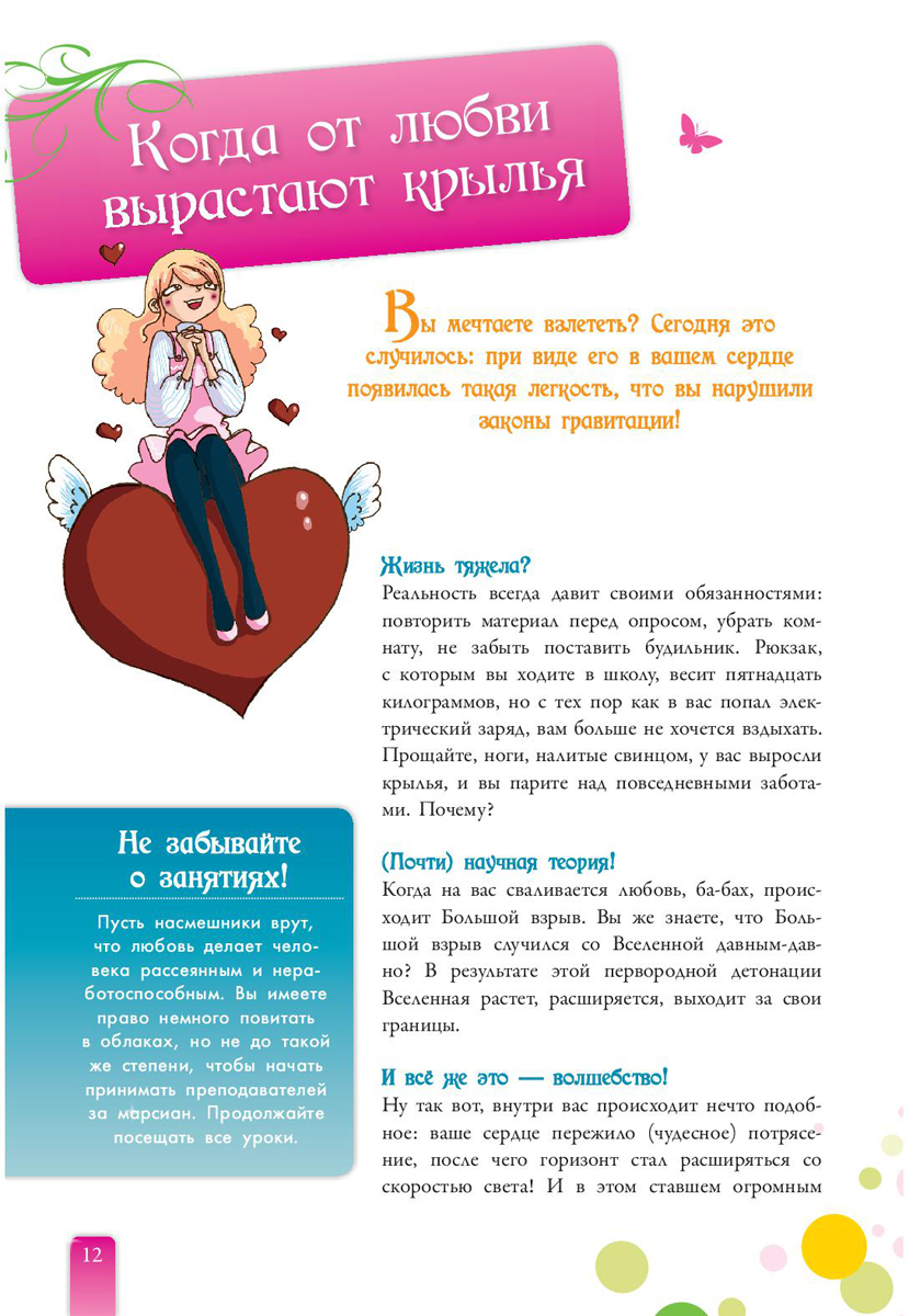 Мечтаешь о большой любви и прекрасном принце на белом коне? Не знаешь, как понравиться однокласснику и как вести себя на первом свидании? Подруга завидует вашим отношениям, а ты ревнуешь? Не можешь прийти в себя после разрыва? Все секреты отношений под одной обложкой: идеи романтичных подарков, советы, как признаться родителям, что ты теперь встречаешься с парнем, ответы на самые распространенные вопросы и даже рецепт шоколадного пирога, от которого твой парень влюбится в тебя еще больше!