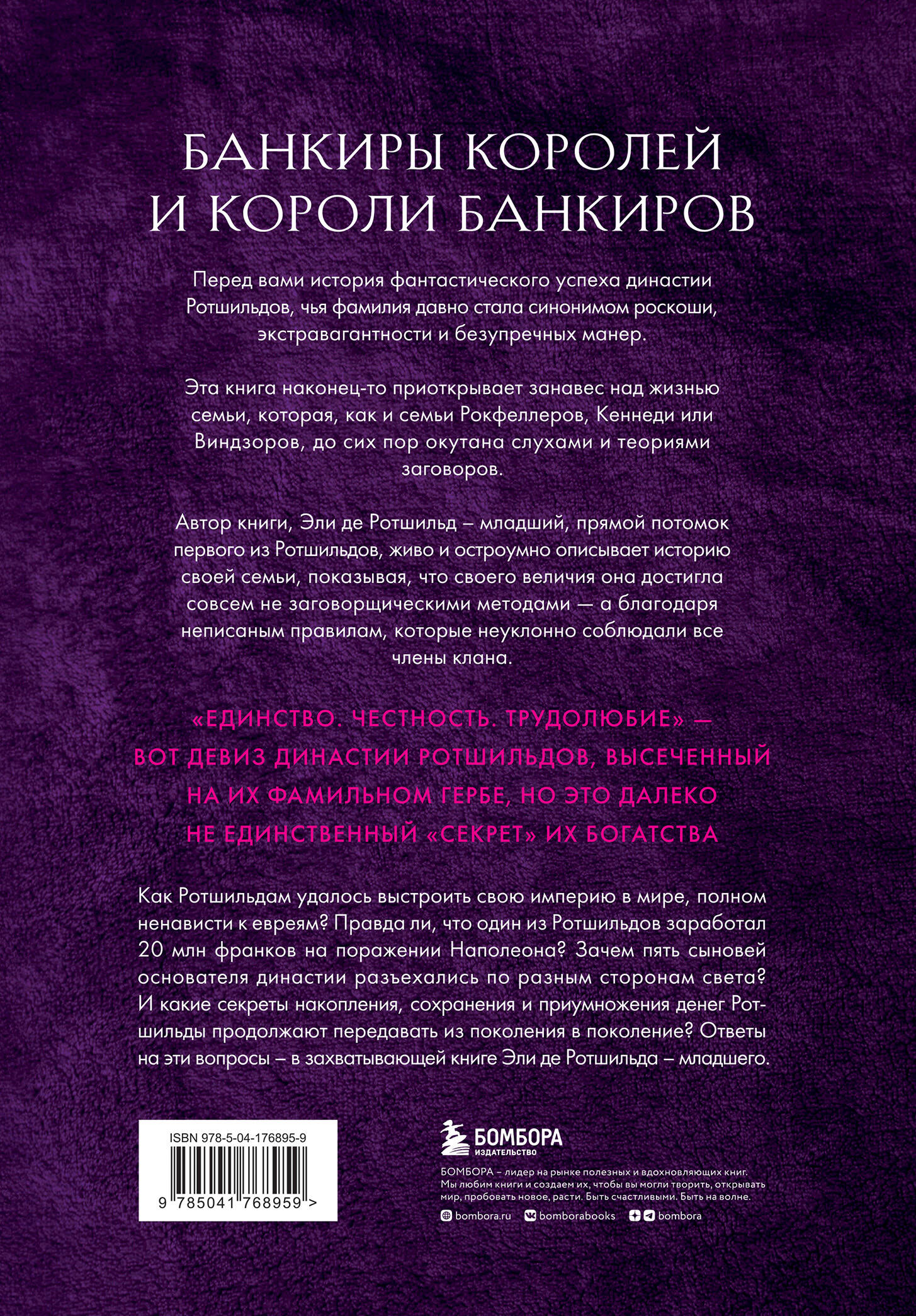 Перед вами история фантастического успеха династии Ротшильдов, чья фамилия давно стала синонимом роскоши, экстравагантности и безупречных манер. Эта книга наконец-то приоткрывает занавес над жизнью семьи, которая, как и семьи Рокфеллеров, Кеннеди или Виндзоров, до сих пор окутана слухами и теориями заговоров. Автор книги, Эли де Ротшильд-младший, прямой потомок первого из Ротшильдов, живо и остроумно описывает историю своей семьи, показывая, что своего величия она достигла совсем не заговорщическими методами - а благодаря неписаным правилам, которые неуклонно соблюдали все члены клана. Как Ротшильдам удалось выстроить свою империю в мире, полном ненависти к евреям? Правда ли, что один из Ротшильдов заработал 20 млн франков на поражении Наполеона? Зачем пять сыновей основателя династии разъехались по разным сторонам света? И какие секреты накопления, сохранения и приумножения денег Ротшильды продолжают передавать из поколения в поколение? Ответы на эти вопросы - в захватывающей книге Эли де Ротшильда-младшего.| Издательство | ООО "Издательство "Эксмо" |