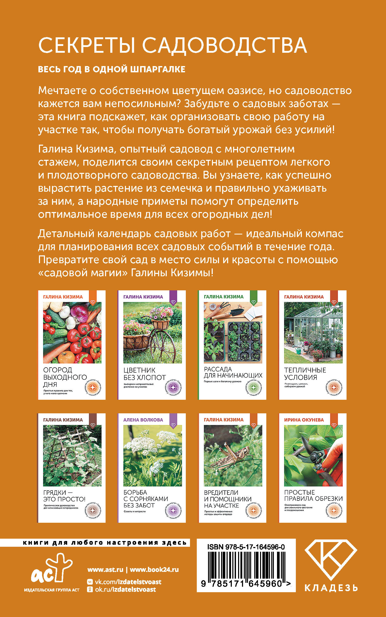Мечтаете о собственном цветущем оазисе, но садоводство кажется вам непосильным? Забудьте о садовых заботах - эта книга подскажет, как организовать свою работу на участке так, чтобы получать богатый урожай без усилий! Галина Кизима, опытный садовод с многолетним стажем, поделится своим секретным рецептом легкого и плодородного садоводства. Вы узнаете, как успешно вырастить растение из семечка и правильно ухаживать за ним, а авторские пошаговые инструкции и народные приметы помогут вам определить оптимальное время для садовых работ и превратят их в приятное хобби! Детальный календарь садовых работ - идеальный компас для планирования всех садовых событий в течение года. Превратите свой сад в место силы и красоты с помощью "садовой магии" Галины Кизимы!| Издательство | Издательство "АСТ" |