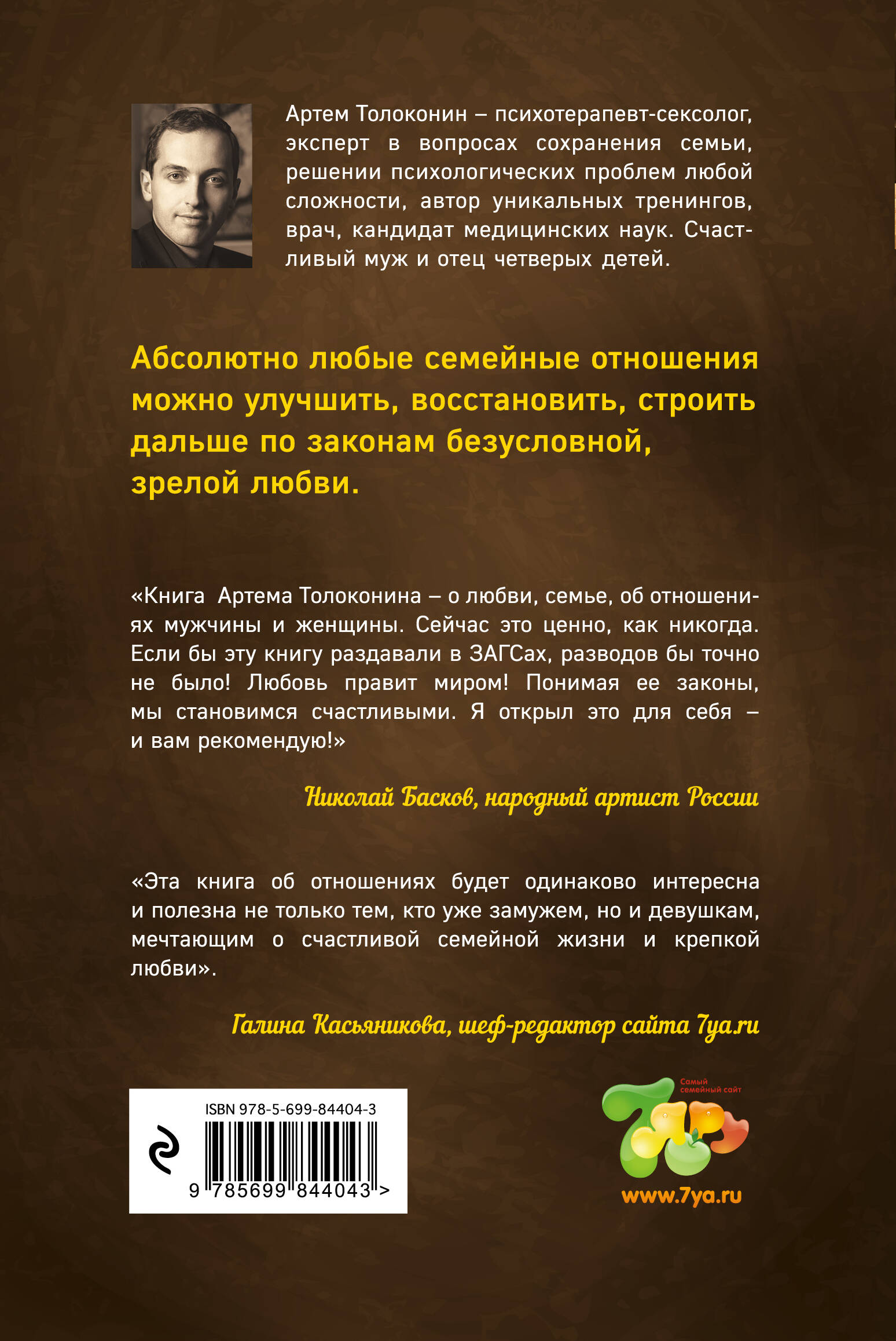 Для кого эта книга Для семей, переживающих кризис. Для тех, кто еще не замужем, но мечтает создать крепкую и любящую семью. Для профессиональных психологов. Фишки книги Методика сформирована в результате многолетних исследований и наблюдений. Примеры из реальной жизни и знаменитых фильмов. Книга построена в виде диалога автора с читателем таким образом, что читатель получает ответы на все волнующие его вопросы. Об авторе Артем Толоконин - психотерапевт-сексолог, эксперт в вопросах сохранения семьи, решении психологических проблем любой сложности, автор уникальных тренингов, врач, кандидат медицинских наук. Счастливый муж и отец троих детей. Отзывы «Эта книга об отношениях будет одинаково интересна и полезна не только тем, кто уже замужем, но и девушкам, мечтающим о счастливой семейной жизни и крепкой любви». - Галина Касьяникова, шеф-редактор. «Книга Артема Толоконина - о любви, о семье, об отношениях мужчины и женщины. Сейчас это ценно, как никогда. Если бы эту книгу раздавали в ЗАГСах, разводов бы точно не было! Любовь правит миром! Понимая ее законы, мы становимся счастливыми. Я открыл это для себя - и вам рекомендую!» - Николай Басков, народный артист России| Издательство | ООО "Издательство "Эксмо" |