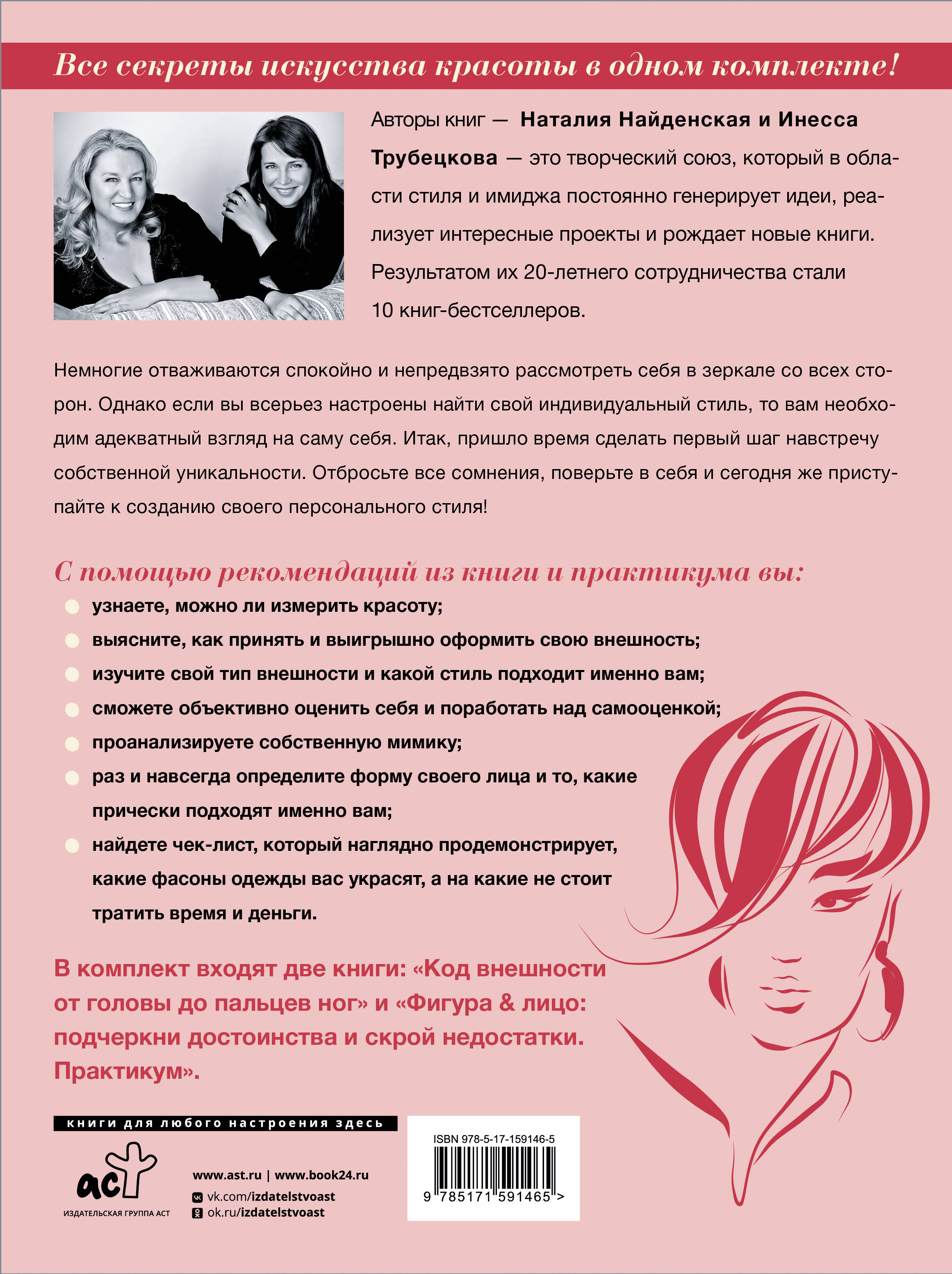 Все секреты искусства красоты в одном комплекте! Авторы книги Наталия Найденская и Инесса Трубецкова - это творческий союз, который в области cтиля и имиджа постоянно генерирует идеи, реализует интересные проекты и рождает новые книги. Результатом их 20-летнего сотрудничества стали 10 книг-бестселлеров. Немногие отваживаются спокойно и непредвзято рассмотреть себя в зеркале со всех сторон. Однако если вы всерьез настроены найти свой индивидуальный стиль, то вам необходим адекватный взгляд на саму себя. Итак, пришло время сделать первый шаг навстречу собственной уникальности. Отбросьте все сомнения, поверьте в себя и сегодня же приступайте к созданию своего персонального стиля! С помощью рекомендаций из книги и практикума вы: - узнаете, можно ли измерить красоту; - выясните, как принять и выигрышно оформить свою внешность; - изучите свой тип внешности и какой стиль подходит именно вам; - сможете объективно оценить себя и поработать над самооценкой; - проанализируете собственную мимику; - раз и навсегда определите форму своего лица и то, какие прически подходят именно вам; - найдете чек-лист, который наглядно продемонстрирует, какие фасоны одежды вас украсят, а на какие не стоит тратить время и деньги В комплект входят две книги: "Код внешности от головы до пальцев ног" и "Фигура & лицо: подчеркни достоинства и скрой недостатки. Практикум".
