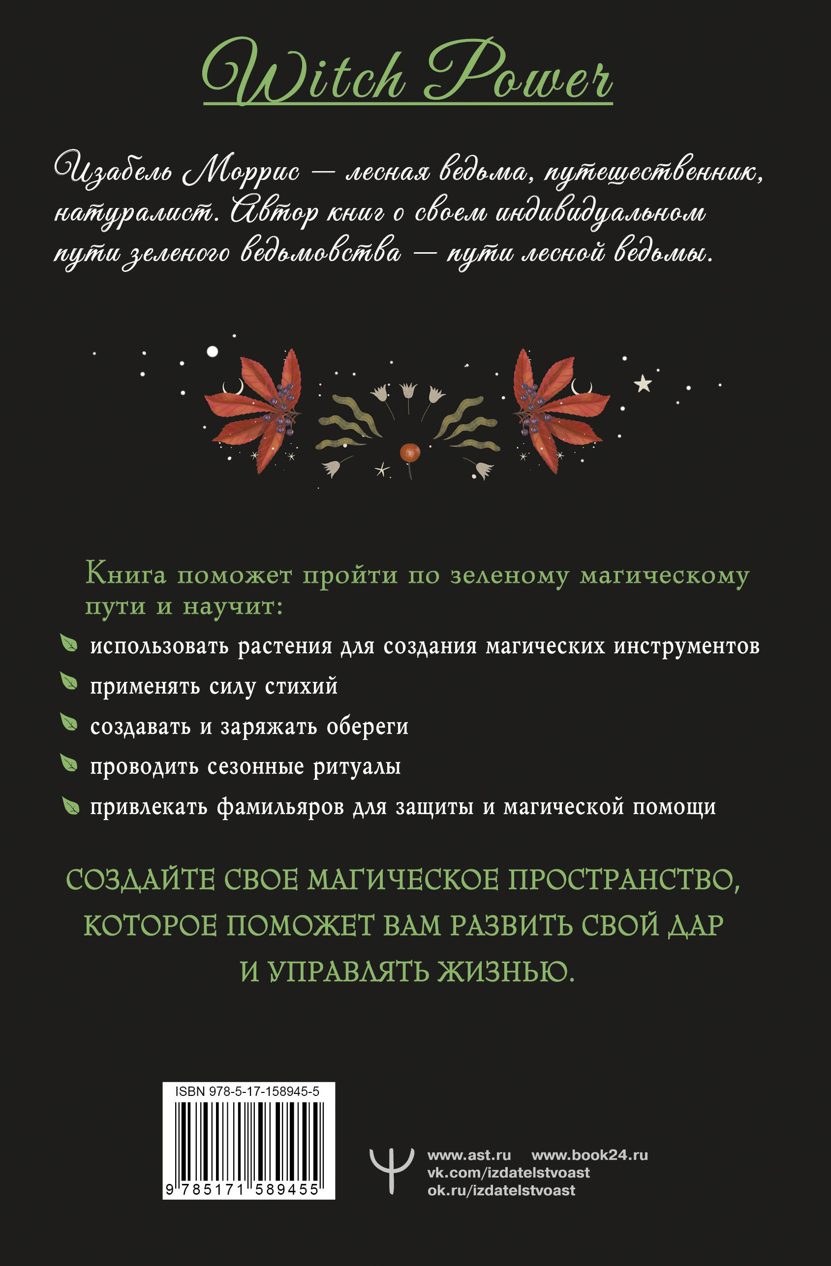 Эта книга поможет вам прикоснуться к энергиям лесной зеленой магии и внести в свою жизнь гармонию и контроль. Обратитесь к вашему внутреннему дару, откройте для себя силу, которую предки черпали из природного мира. Овладейте зелеными инструментами - энергией трав, цветов и деревьев, силой камней и кристаллов, духовной энергией животных и стихий. Обретите собственного фамильяра, который будет помогать и защищать вас. Создайте свое магическое пространство, которое поможет вам развить свой дар и управлять жизнью.| Издательство | Издательство "АСТ" |