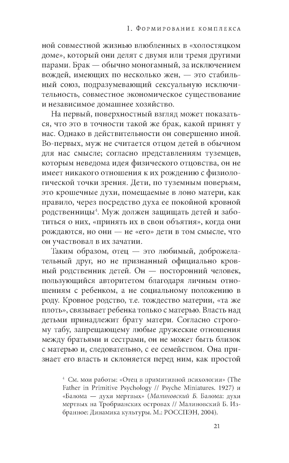 Бронислав Малиновский (1884-1942) - известнейший британский антрополог польского происхождения. Его перу принадлежит ряд увлекательных книг о верованиях и обычаях туземцев Новой Гвинеи и Тробрианских островов. Предлагаемая вниманию читателя работа - не только очередное захватывающее исследование, описывающее сокровенные стороны жизни удивительных обитателей Океании, но и документ эпохи. Малиновский одним из первых стал применять принципы психоанализа в других областях науки, хотя использовал он эти принципы далеко не безоговорочно. Книга, написанная при жизни Фрейда, представляет собой яркую и убедительную полемику с идеями основателя психоанализа и его последователей. Споря с психоанализом, ученый подробно разбирает проблему Эдипова комплекса на богатом материале из жизни матрилинейного общества, а затем постепенно расширяет круг интересов антропологии, осваивая «промежуточную область между наукой о человеке и наукой о животных». Книга будет интересна не только специалистам в области антропологии и психоанализа, но и широкому кругу читателей.