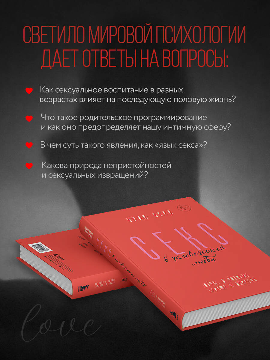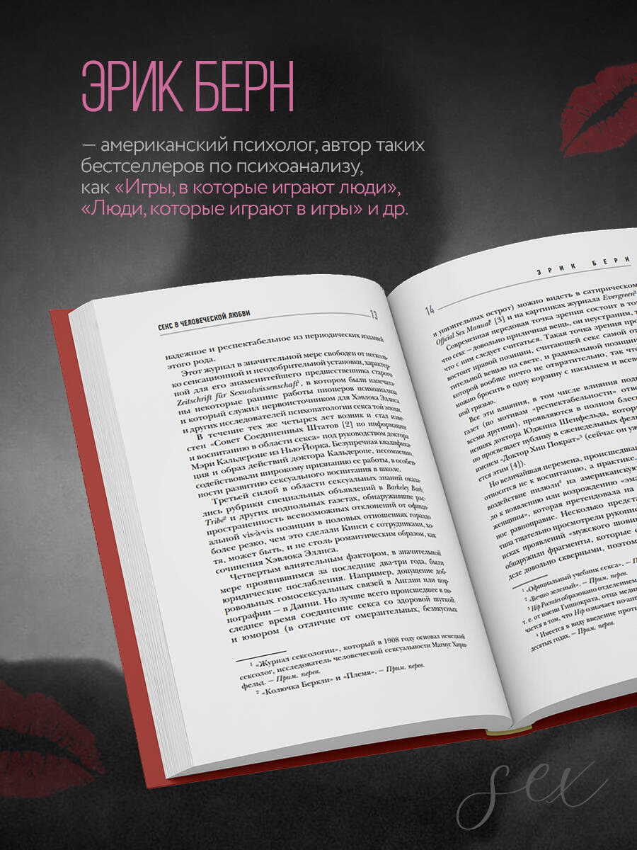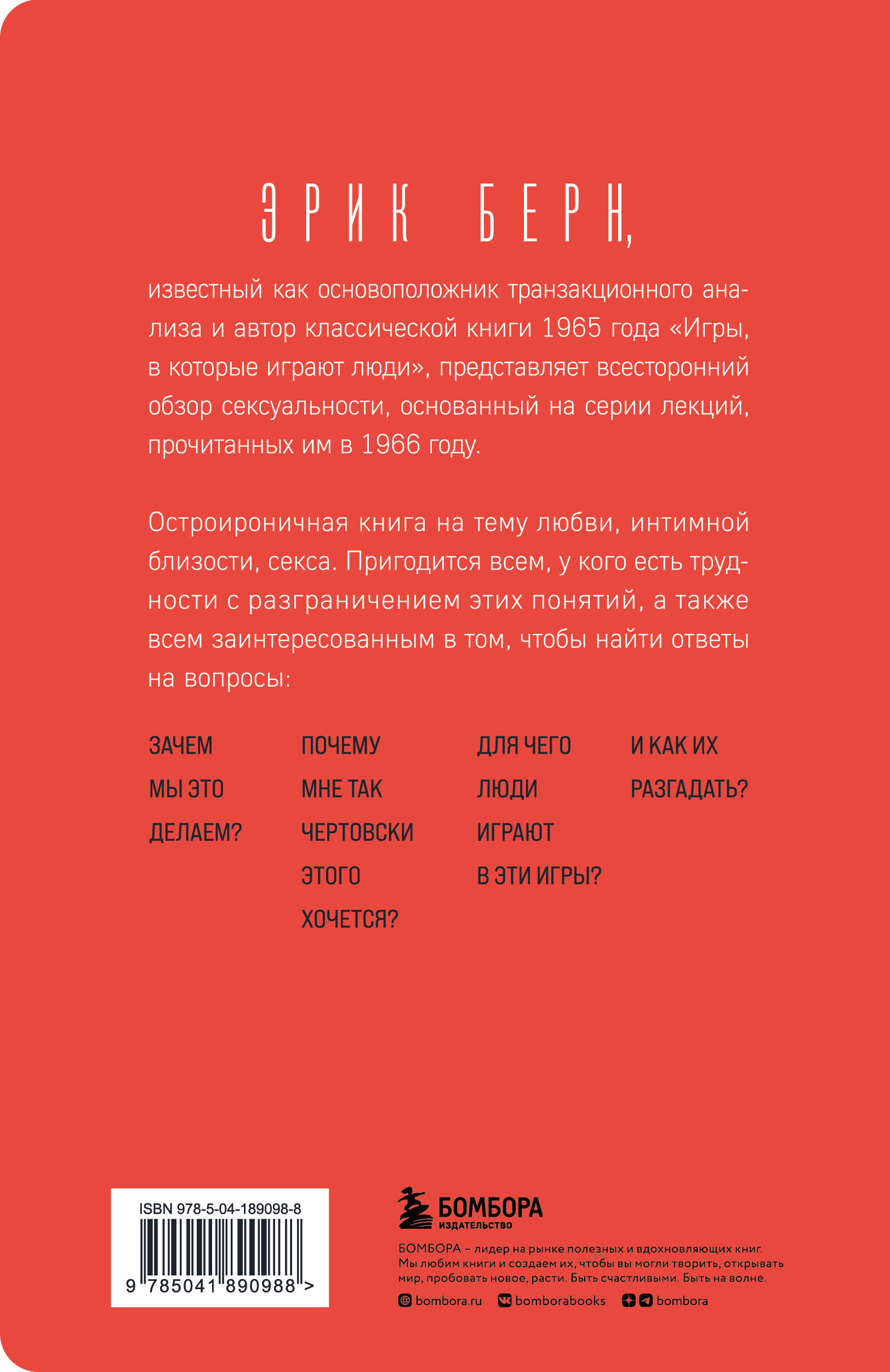 «Первый перевод этой книги на русский язык был издан в сильно сокращенном виде в 1990 году, символизируя завершение эры, когда в нашей стране секса не было. Не случайно книга, стоявшая на моей книжной полке, быстро исчезла в неизвестном направлении. Предположительно, с просветительской миссией. Однако, позаимствовавший ее мог остаться разочарованным, поскольку разделы, написанные именно про секс, в тот перевод как раз и не вошли. Настоящее издание представляет собой полный перевод последнего труда создателя транзактного анализа, вышедшего при его жизни. Книга написана характерным для Эрика Берна образным языком и рассчитана скорее на непрофессионального читателя. Перед переводчиком стояла почти неразрешимая задача передать непереводимую игру слов американского сленга, которым так мастерски пользовался автор. Насколько это удалось - судить вам». - Владимир Гусаковский, сертифицированный транзактный аналитик, тренер и супервизор Европейской и Международной ассоциаций транзактного анализа, психотерапевт Европейского реестра, психолог, к. ф.-м. н. Эрик Берн, известный как основоположник транзакционного анализа и автор классической книги 1965 года «Игры, в которые играют люди», представляет всесторонний обзор сексуальности, основанный на серии лекций, прочитанных им в 1966 году. Остро-ироничная книга на тему любви, интимности, близости, секса. Пригодится всем, у кого есть трудности с разграничением этих понятий, а также всем заинтересованным в том, чтобы найти ответы на вопросы: - Зачем мы это делаем? - Почему мне так чертовски этого хочется? - Для чего люди играют в эти игры? - И как их разгадать?| Издательство | ООО "Издательство "Эксмо" |