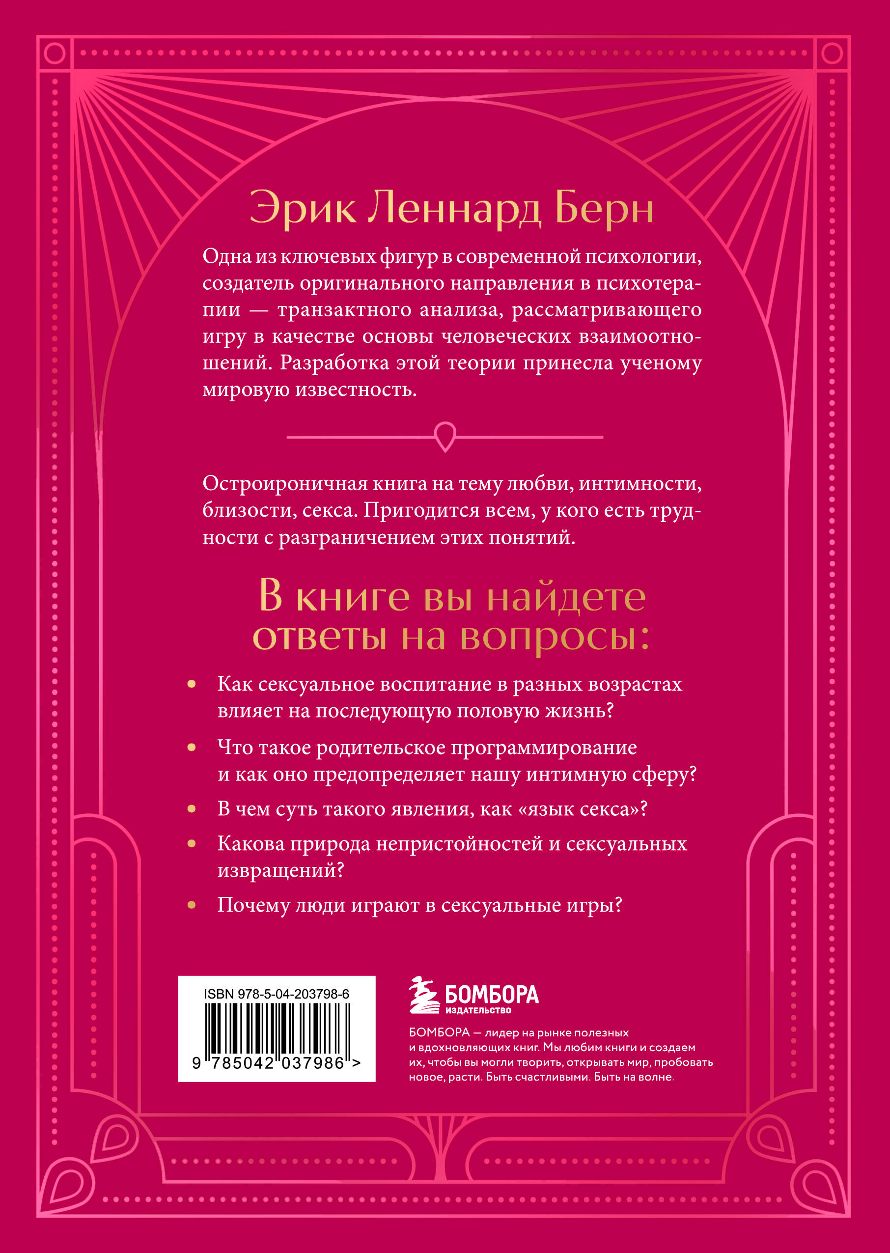 «Первый перевод этой книги на русский язык был издан в сильно сокращенном виде в 1990 году, символизируя завершение эры, когда в нашей стране секса не было. Не случайно книга, стоявшая на моей книжной полке, быстро исчезла в неизвестном направлении. Предположительно, с просветительской миссией. Однако позаимствовавший ее мог остаться разочарованным, поскольку разделы, написанные именно про секс, в тот перевод как раз и не вошли. Настоящее издание представляет собой полный перевод последнего труда создателя транзактного анализа, вышедшего при его жизни. Книга написана характерным для Эрика Берна образным языком и рассчитана скорее на непрофессионального читателя. Перед переводчиком стояла почти неразрешимая задача передать непереводимую игру слов американского сленга, которым так мастерски пользовался автор. Насколько это удалось - судить вам». - Владимир Гусаковский, сертифицированный транзактный аналитик, тренер и супервизор Европейской и Международной ассоциаций транзактного анализа, психотерапевт Европейского реестра, психолог, к. ф.-м. н. Эрик Берн, известный как основоположник транзакционного анализа и автор классической книги 1965 года «Игры, в которые играют люди», представляет всесторонний обзор сексуальности, основанный на серии лекций, прочитанных им в 1966 году. Остро ироничная книга на тему любви, интимности, близости, секса. Пригодится всем, у кого есть трудности с разграничением этих понятий, а также всем заинтересованным в том, чтобы найти ответы на вопросы: - Зачем мы это делаем? - Почему мне так чертовски этого хочется? - Для чего люди играют в эти игры? - И как их разгадать?| Издательство | ООО "Издательство "Эксмо" |