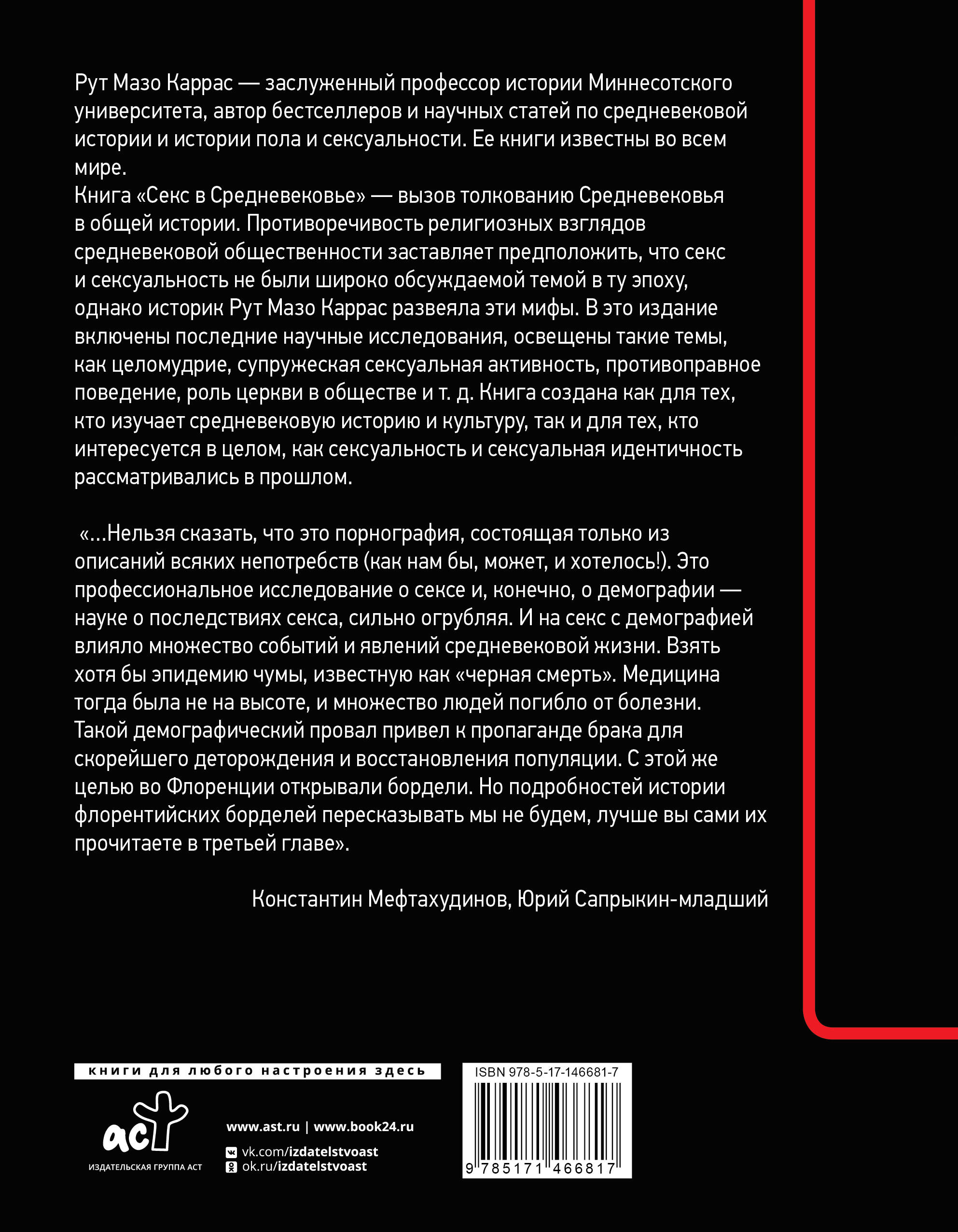 Рут Мазо Каррас - заслуженный профессор истории Миннесотского университета, автор бестселлеров и научных статей по средневековой истории и истории пола и сексуальности. Ее книги известны во всем мире. Книга "Секс в Средневековье" - вызов толкованию Средневековья в общей истории. Противоречивость религиозных взглядов средневековой общественности заставляет предположить, что секс и сексуальность не были широко обсуждаемой темой в ту эпоху, однако историк Рут Мазо Каррас развеяла эти мифы. В это издание включены последние научные исследования, освещены такие темы как целомудрие, супружеская сексуальная активность, противоправное поведение, роль церкви в обществе и т д. Книга создана как для тех, кто изучает средневековую историю и культуру, так и для тех, кто интересуется в целом, как сексуальность и сексуальная идентичность рассматривались в прошлом.| Издательство | Издательство "АСТ" |