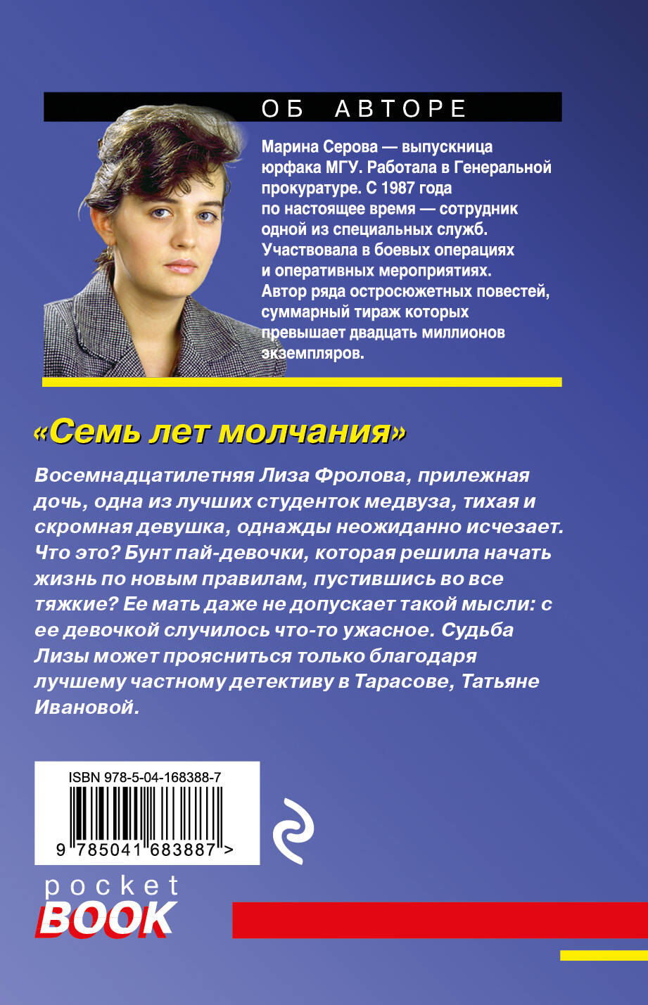 Марина Серова - феномен современного отечественного детективного жанра. Выпускница юрфака МГУ, работала в Генеральной прокуратуре. С 1987 года по настоящее время - сотрудник одной из специальных служб. Участвовала в боевых операциях и оперативных мероприятиях. Автор ряда остросюжетных повестей, суммарный тираж которых превышает двадцать миллионов экземпляров. Частный детектив Татьяна Иванова, известная во всем Тарасове своим талантом раскрывать самые сложные дела, решилась помочь новым героям. На этот раз сыщице предстоит разобраться в истории, которую так и не смогла расследовать полиция. Восемнадцатилетняя Лиза Фролова, прилежная дочь, одна из лучших студенток медвуза, тихая и скромная девушка, однажды неожиданно исчезает. Что это? Бунт пай-девочки, которая решила начать жизнь по новым правилам, пустившись во все тяжкие? Ее мать даже не допускает такой мысли: с ее девочкой случилось что-то ужасное. Судьба Лизы может проясниться только благодаря лучшему частному детективу в Тарасове - Татьяне Ивановой.| Издательство | Эксмо |