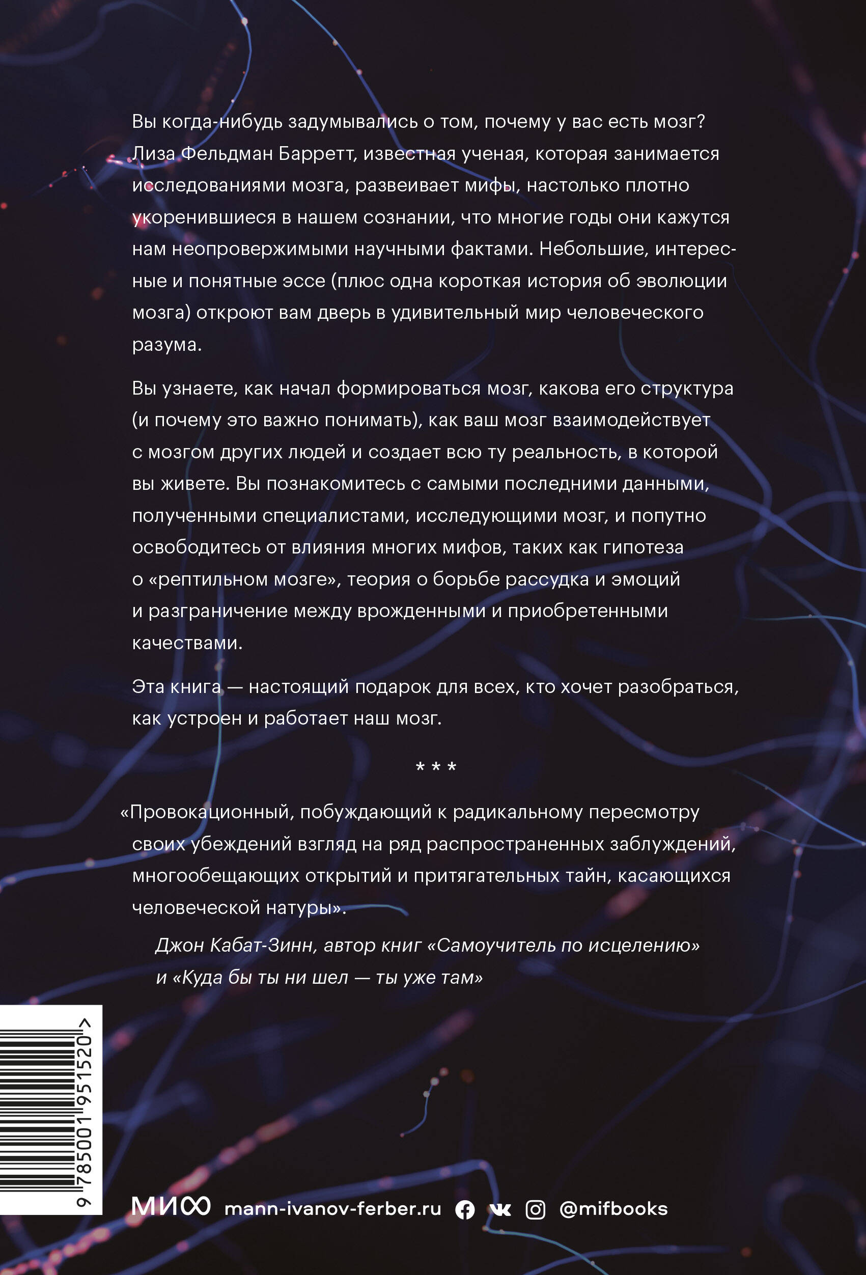 Семь коротких захватывающих эссе о человеческом мозге, написанные автором книги "Как рождаются эмоции". Вы когда-нибудь задумывались о том, почему у вас есть мозг? Лиза Фельдман Барретт, известная ученая, занимающаяся исследованиями мозга, развенчивает мифы, плотно укоренившиеся в нашем сознании. Небольшие, интересные и понятные эссе откроют вам дверь в удивительный мир человеческого разума. Вы узнаете, как начал формироваться мозг, какова его структура и почему это важно понимать, как ваш мозг взаимодействует с мозгом других людей и создает реальность, в которой вы живете. Вы познакомитесь с самыми последними данными, полученными специалистами, исследующими мозг, и попутно освободитесь от влияния многих мифов, таких как гипотеза о "рептильном мозге", теория о борьбе рассудка и эмоций и разграничение между врожденными и приобретенными качествами. Эта книга - настоящий подарок, для всех, кто хочет разобраться, как устроен и работает наш мозг. Для кого книга: Для всех, кто хочет разобраться, как действительно устроен и работает наш удивительный и загадочный орган - мозг. Для всех, кто хочет по-новому взглянуть на природу человека. Для всех, кто хочет поразмышлять о том, каким человеком вы являетесь или хотели бы стать. От автора: Цель этой книги, состоящей из коротких эссе - заинтриговать и развлечь читателей. Ее нельзя назвать полноценным пособием для изучения работы мозга. В каждом эссе вы найдете несколько любопытных научных фактов о нашем мозге, которые позволят по-новому взглянуть на природу человека. Лучше всего читать эти очерки по порядку, но, если хотите, можете начинать с любого. Надеюсь, вам придется по душе то, насколько необычен человеческий мозг с точки зрения ученого, занимающегося его тщательным исследованием. Уверена, вы будете удивлены, узнав, насколько сильно от почти полуторакилограммового комка, находящегося у нас между ушами, зависит человеческая натура. О ней можно думать по-разному, и в эссе никаких строгий указаний на этот счет нет. Я просто предлагаю вам поразмышлять о том, каким человеком вы являетесь или хотели бы стать.