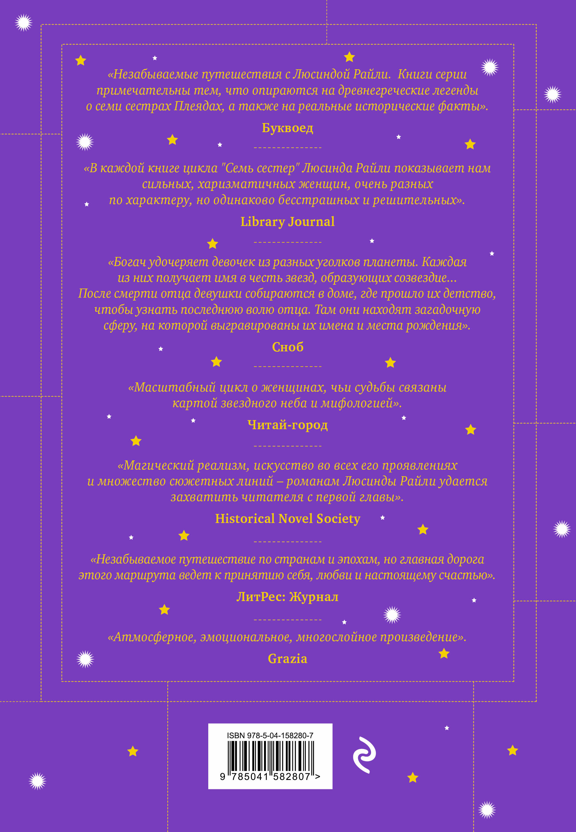 СЕДЬМАЯ КНИГА ЗНАМЕНИТОГО ЦИКЛА «СЕМЬ СЕСТЕР». Это история последней, «потерянной» сестры Деплеси. Загадка, которая так долго оставалась без ответа! Благодаря завещанию приемного отца Па Солта каждая из шести сестер Деплеси смогла отправиться в уникальное путешествие на земли предков и узнать тайну своего рождения. Но один вопрос по-прежнему остается без ответа. Кем является их потерянная седьмая сестра, которую так и не удочерил Па Солт? Где ее искать? У сестер Деплеси есть лишь одна подсказка - кольцо с семью изумрудами. Из Новой Зеландии в Канаду, Францию и Ирландию - храбрые женщины семьи Деплеси вновь отправляются в путь. Перед ними откроется удивительная история любви и самопожертвования, начало которой было положено почти век назад. Добро пожаловать в красочный подзвездный мир сестер Деплеси.| Издательство | ООО "Издательство "Эксмо" |