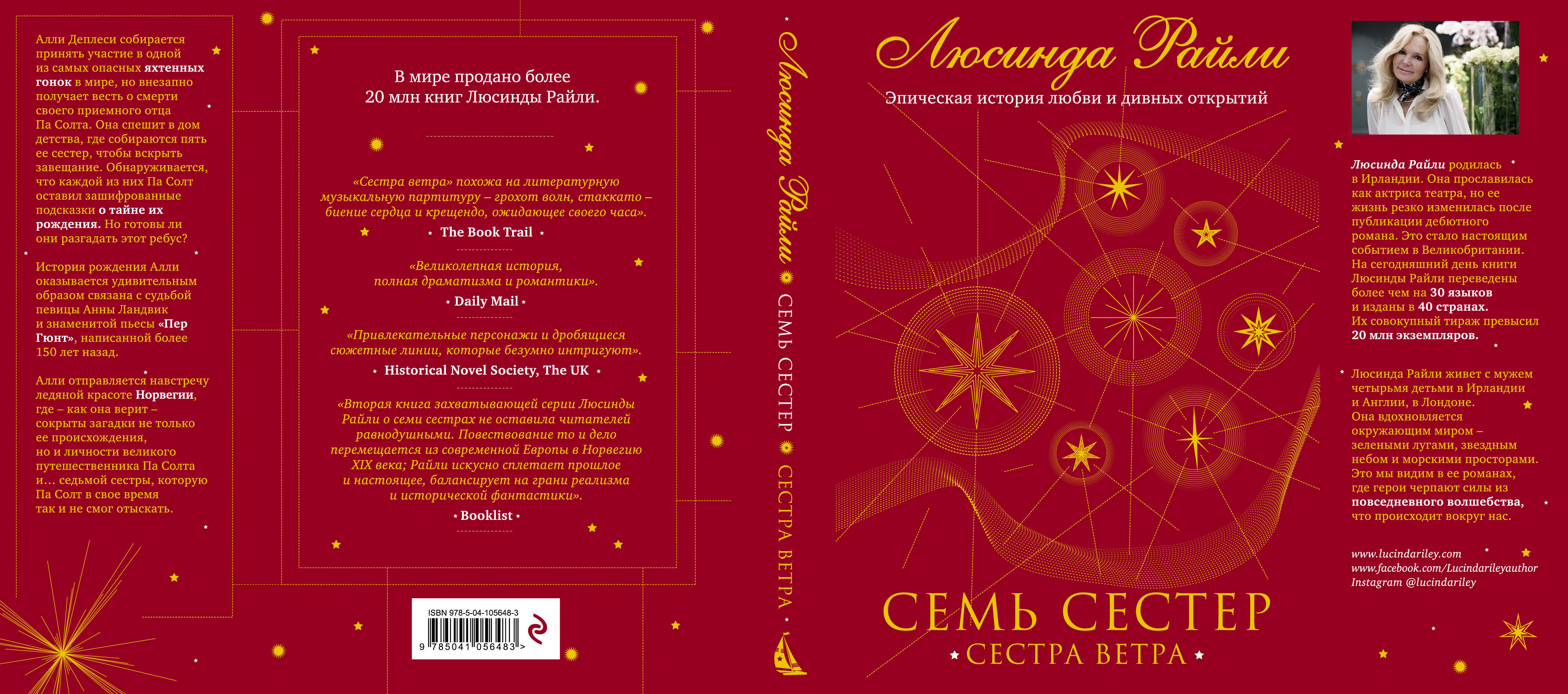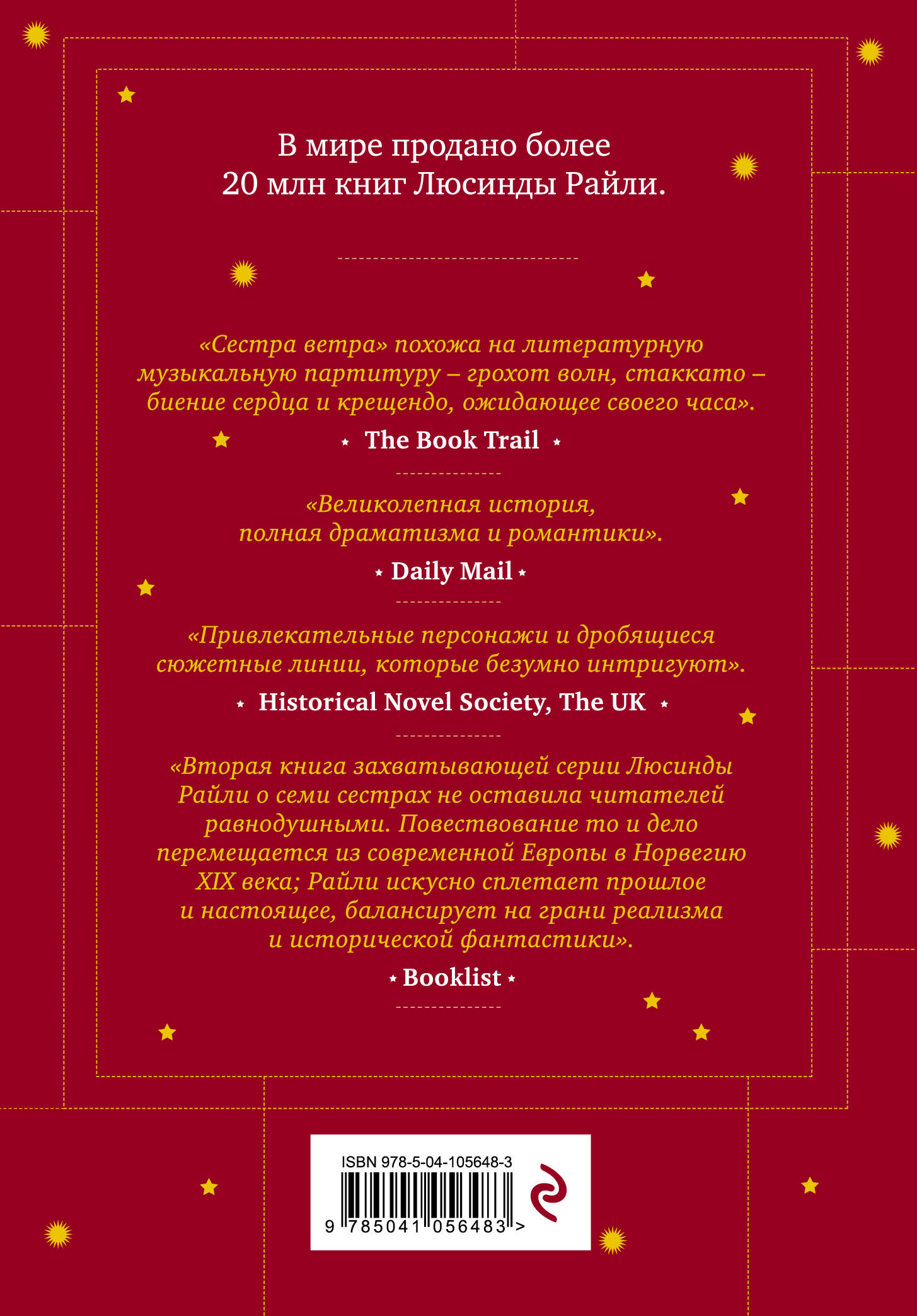 Люсинда Райли родилась в Ирландии. Она прославилась как актриса театра, но ее жизнь резко изменилась после публикации дебютного романа. Это стало настоящим событием в Великобритании. На сегодняшний день книги Люсинды Райли переведены более чем на 30 языков и изданы в 40 странах. Совокупный тираж превысил 20 млн экземпляров. Люсинда Райли живет с мужем и четырьмя детьми в Ирландии и Англии, в Лондоне. Она вдохновляется окружающим миром - зелеными лугами, звездным небом и морскими просторами. Это мы видим в ее романах, где герои черпают силы из повседневного волшебства, что происходит вокруг нас. «Вторая книга захватывающей серии Люсинды Райли о шести (семи?) сестрах не оставила читателей равнодушными. Повествование то и дело перемещается из современной Европы в Норвегию XIX века; Райли искусно сплетает прошлое и настоящее, балансирует на грани реализма и исторической фантастики». - Booklist «"Сестра ветра" похожа на литературную музыкальную партитуру - грохот волн, стаккато - биение сердца и крещендо, ожидающее своего часа». - The Book Trail «Великолепная история, полная драматизма и романтики». - Daily Mail «Привлекательные персонажи и дробящиеся сюжетные линии, которые безумно интригуют». - Historical Novel Society, The UK